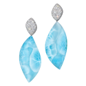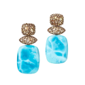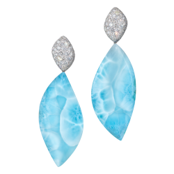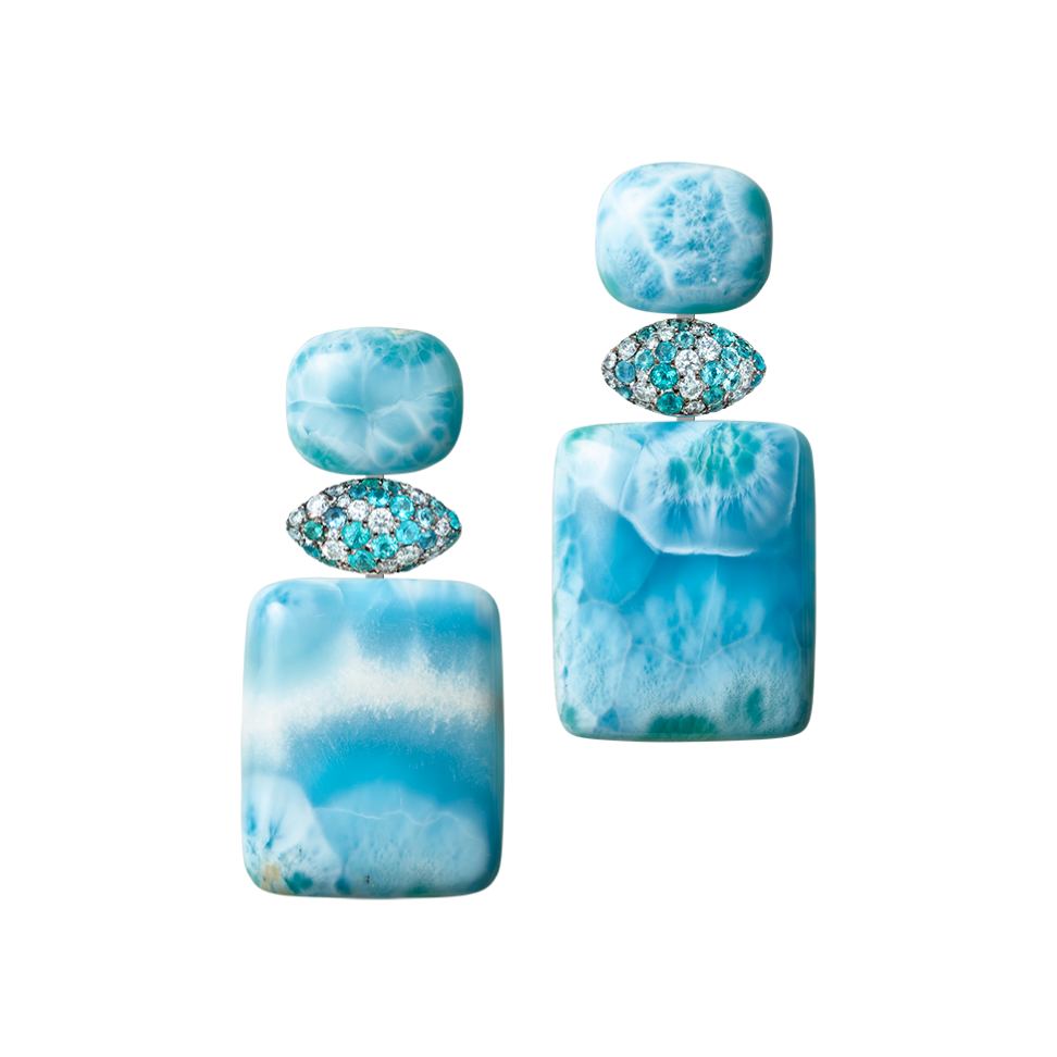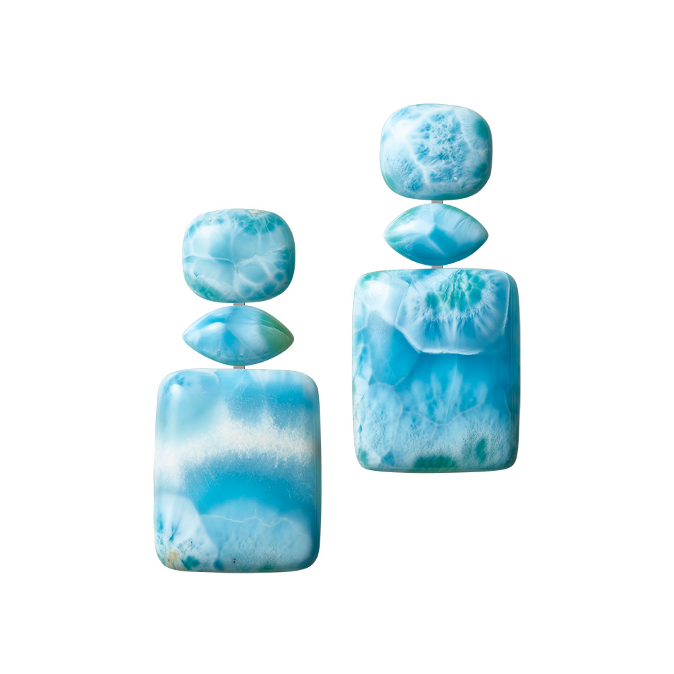 Ohrringe aus Larimar-Cabochons in geometrischen Formen, mit weiteren Edelsteinen individualisierbar. Dank unsichtbarer Wechselmechaniken "Trinity Transformers" lassen sie sich kurz oder lang tragen oder mit anderen Elementen kombinieren. Maßanfertigung, gezeigte Länge 6,5 cm.