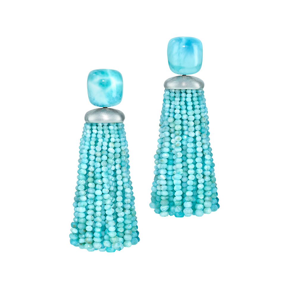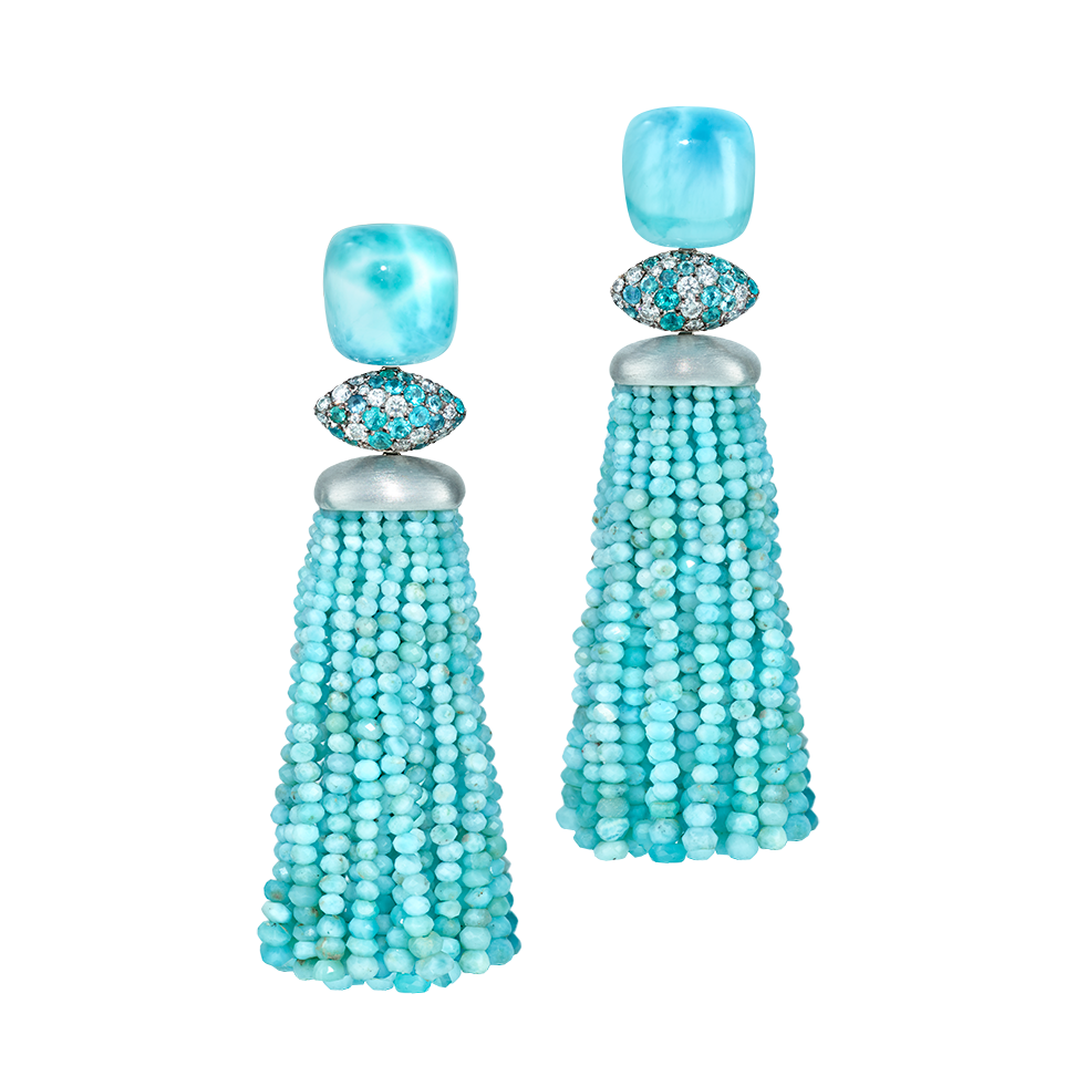 Gleich der Aura von Wasserfällen strahlen die Ohrgehänge „Caribbean Waterfalls“ eine belebende Energie aus. Ihre Larimar-Oberteile ergießen sich in Paraiba-Diamant-Navettes und Quasten aus feinen Larimar-Perlen.