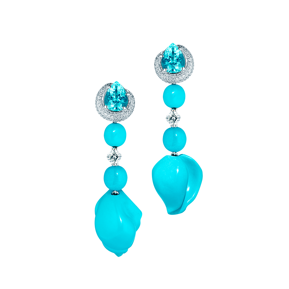 Ohrring-Chandeliers mit Anhängern aus muschel- und perlenförmigen Türkisen und kissenförmig geschliffenen Diamanten sowie Oberteilen aus tropfenförmigen Paraiba-Turmalinen, die teils von Diamanten gerahmt und in 750/000 Weißgold gefasst sind. Dank unsichtbarer Wechselmechaniken lassen sie sich kurz oder lang tragen. Maßanfertigung, gezeigte Länge 4,5 cm.