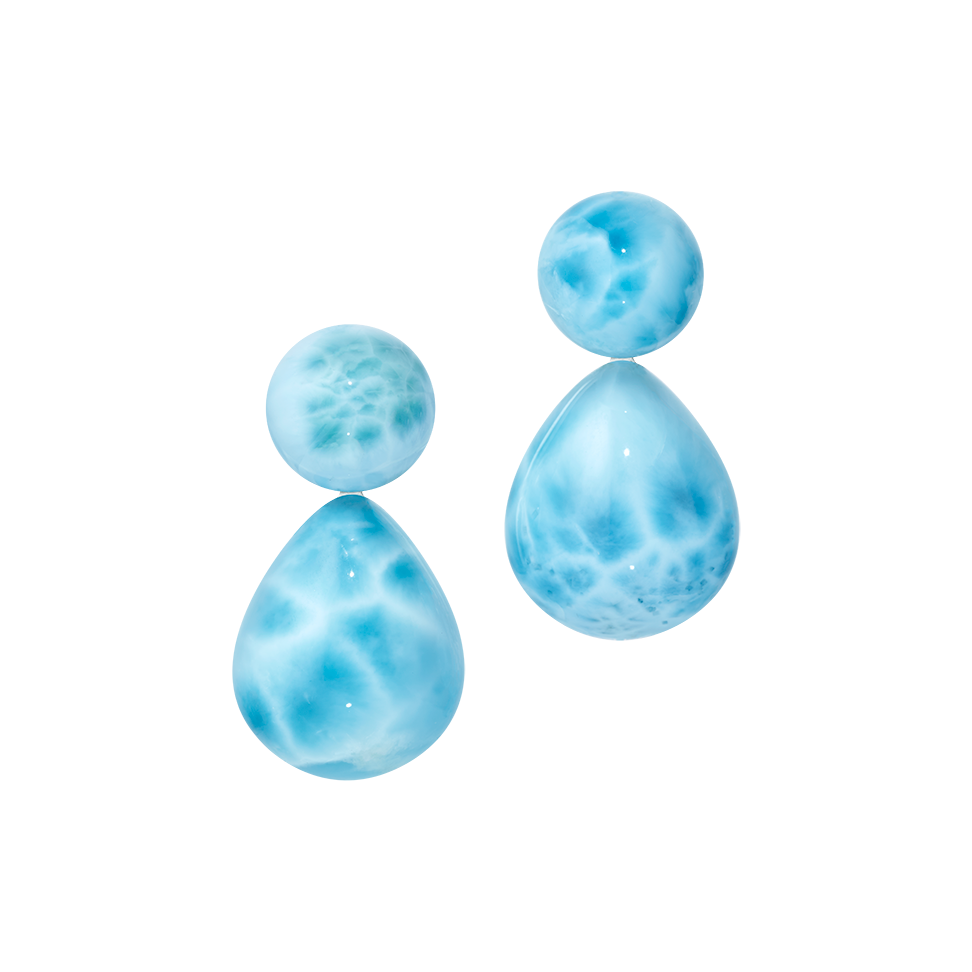 Ohrringe aus Larimar-Kugeln und -Tropfen, durchzogen von Rinons. Dank unsichtbarer Wechselmechaniken lassen sich die Oberteile einzeln tragen oder mit anderen Anhängern kombinieren. Maßanfertigung, gezeigte Länge 4 cm.