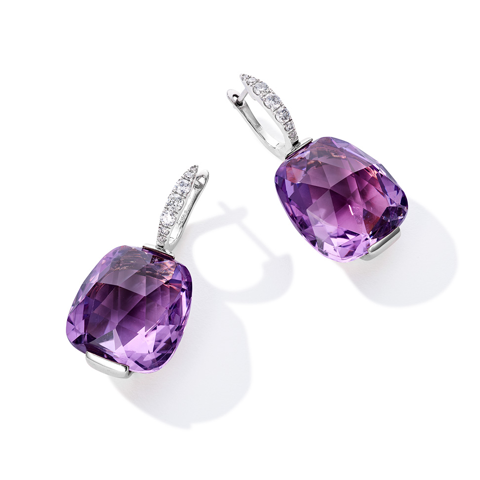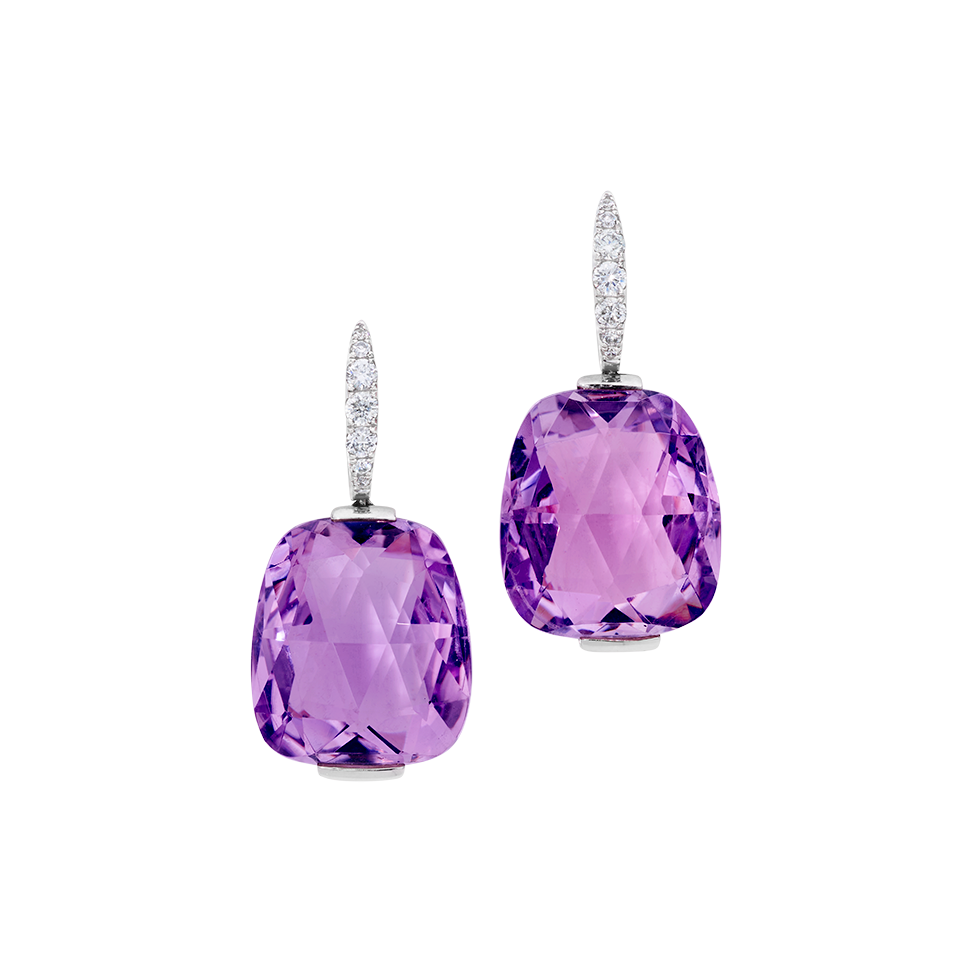 Fein diamantierte Creolen mit Amethyst-Anhängern, in 750/000 Weißgold gefasst.