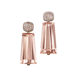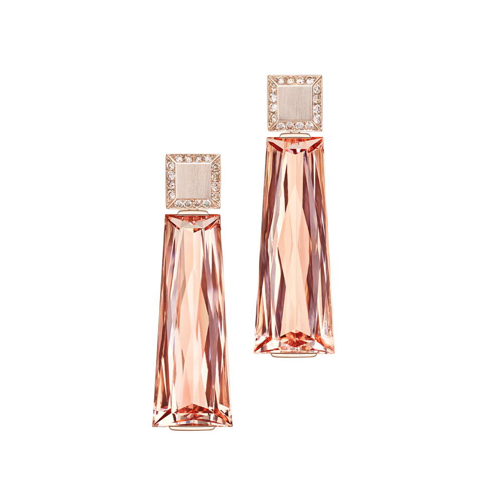 Zweiteilige Ohrringe mit trapezförmigen Morganiten im Scherenschliff und quadratischen Oberteilen aus mattiertem 750/000 Weißgold, die von naturfarbenen Diamanten umrandet sind. Durch eine unsichbare Wechselmechanik lassen sie sich mit anderen Elementen kombinieren. Maßanfertigung, gezeigte Länge 5 cm.