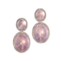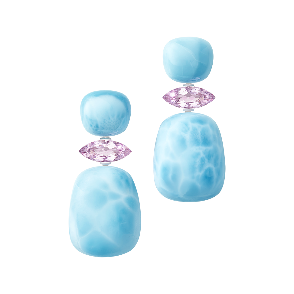 Dreiteilige Ohrringe mit Larimar-Cabochons und navettegeschliffenen Madagaskar-Morganiten, in 750/000 Weißgold gefasst. Dank unsichtbarer Wechselmechaniken lassen sich die Ohrringe kurz oder lang tragen und mit anderen Elementen kombinieren.