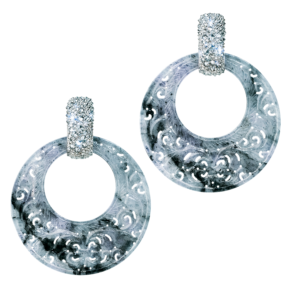 Ohrringe mit gravierter chinesischer Jade und Halbcreolen aus grauen Diamanten, in 750/000 Weißgold gefasst. Die Oberteile lassen sich auch einzeln tragen und mit anderen Elementen kombinieren. Maßanfertigung, gezeigte Länge 6 cm.