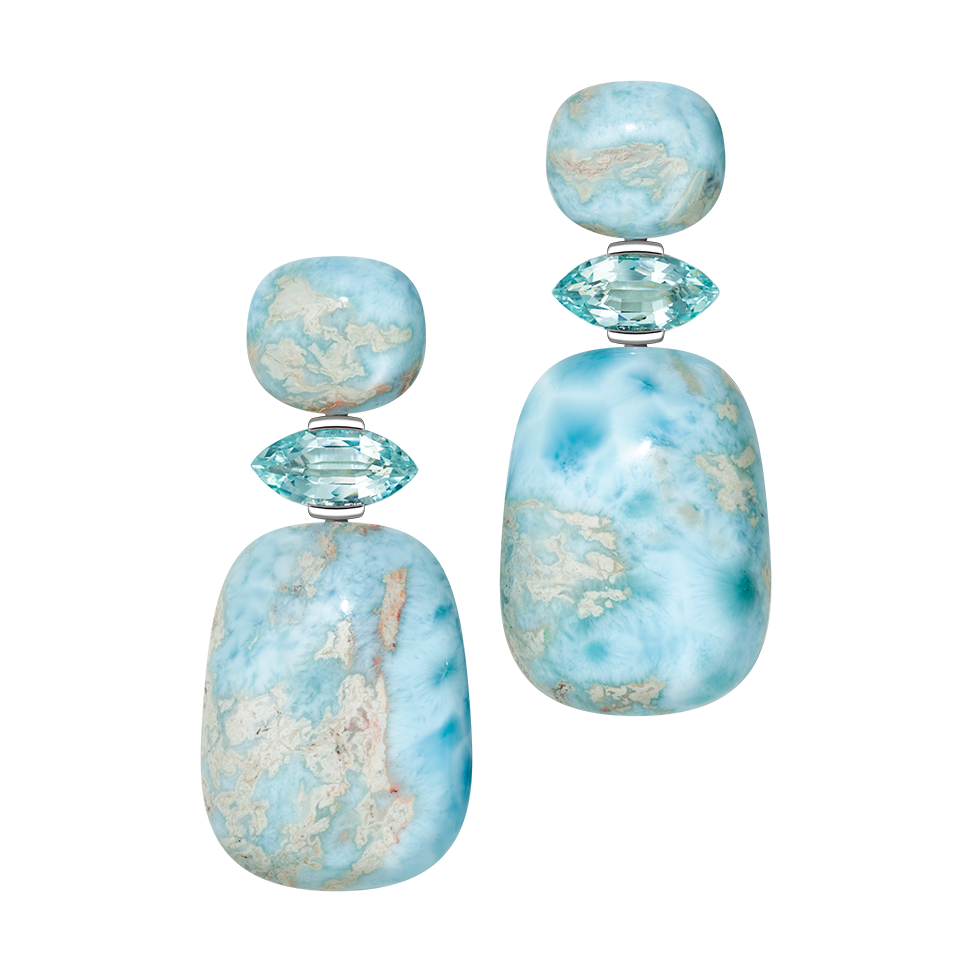 Dreiteilige Ohrringe mit Larimar-Cabochons und navetteförmigen Aquamarinen, gefasst in 750 Weißgold. Dank unsichtbaren Wechselmechaniken lassen sie sich kurz oder lang tragen und mit anderen Elementen kombinieren.