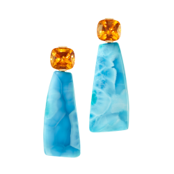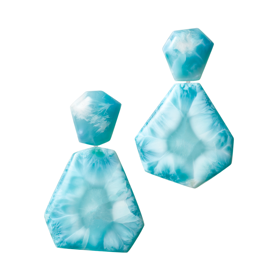 Ohrringe aus transluzentem Larimar, zu Katamaran-Segeln geschliffen und mit weiteren Edelsteinen individualisierbar. Dank unsichtbarer Wechselmechaniken lassen sich die Oberteile einzeln tragen oder mit anderen Anhängern kombinieren. Maßanfertigung, gezeigte Länge 7 cm.