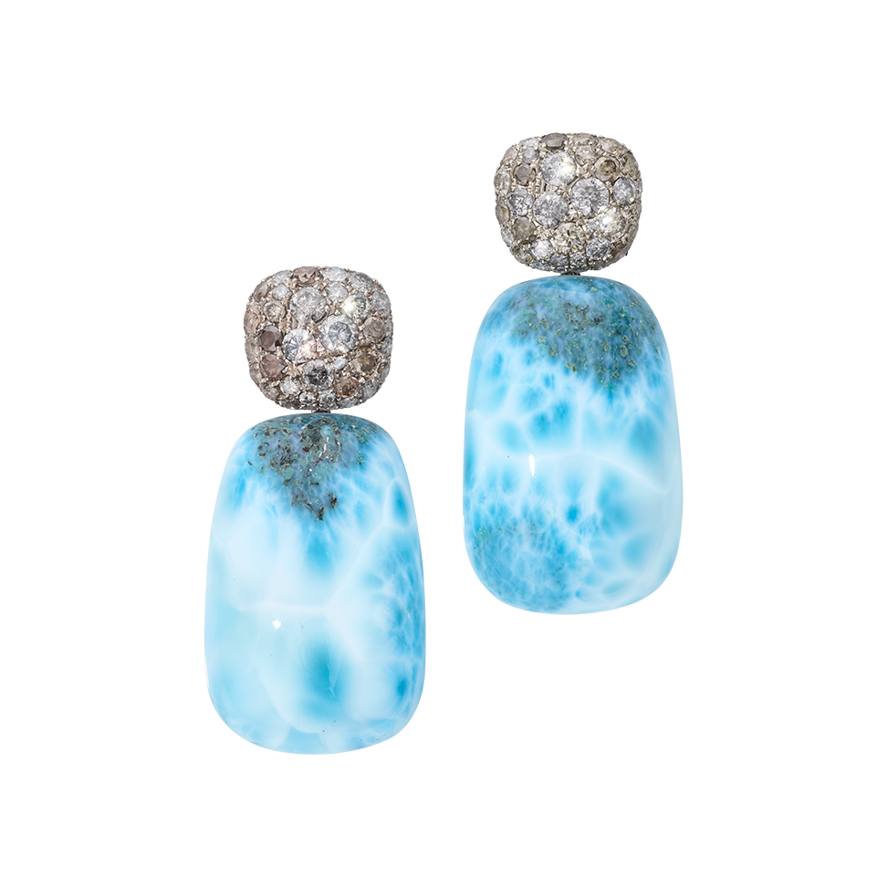 Zweiteilige Ohrringe mit Larimar, durchzogen von Muttergestein, sowie braun-grau diamantierten Oberteilen, in Goldbronze und 750/000 Weißgold gefasst. Dank unsichtbarer Wechselmechaniken lassen sie sich kurz oder lang tragen und mit anderen Elementen kombinieren.