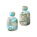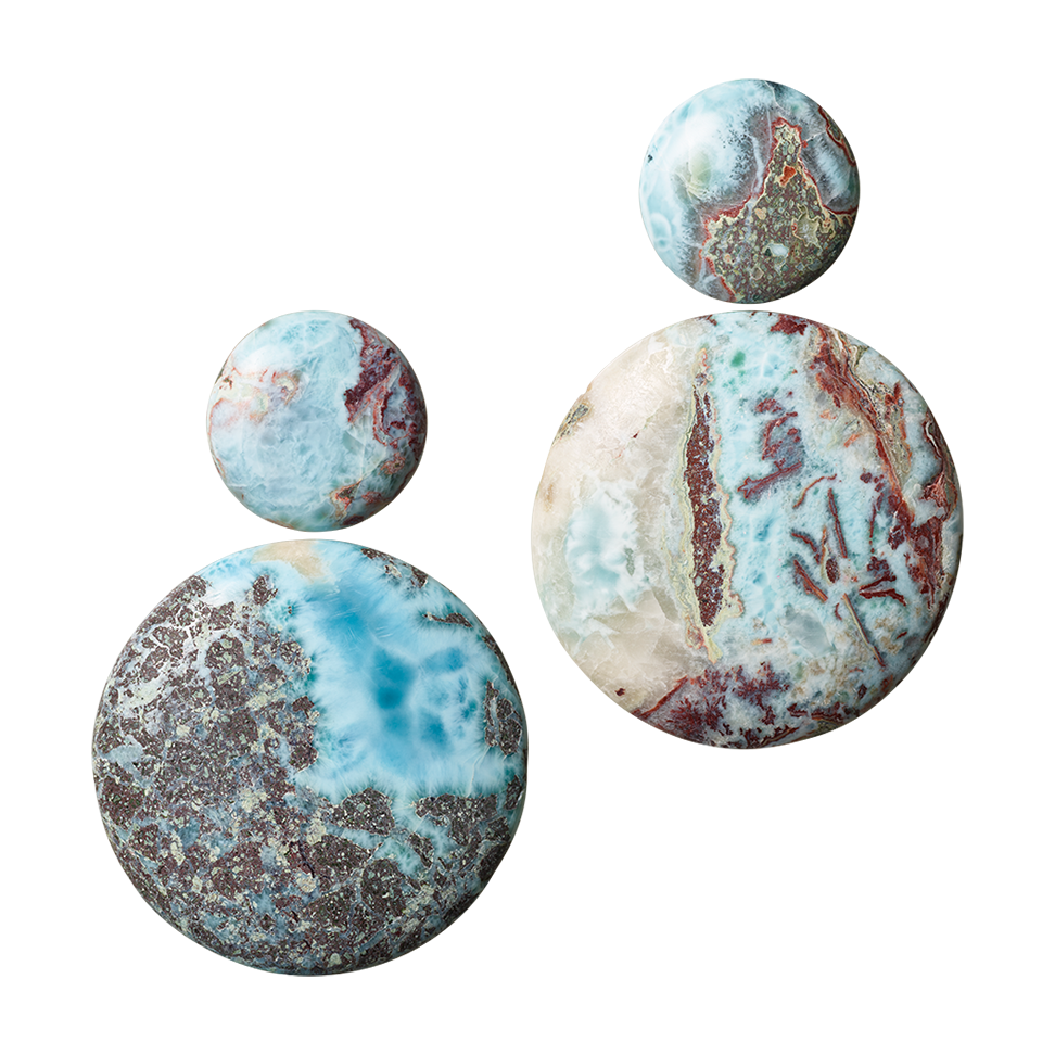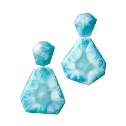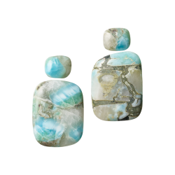 Ohrringe aus Larimar-Scheiben in den Farbtönen von Korallenriffen, mit weiteren Edelsteinen individualisierbar. Dank unsichtbarer Wechselmechaniken lassen sich die Oberteile einzeln tragen oder mit anderen Anhängern kombinieren. Maßanfertigung, gezeigte Länge 6,5 cm.