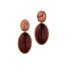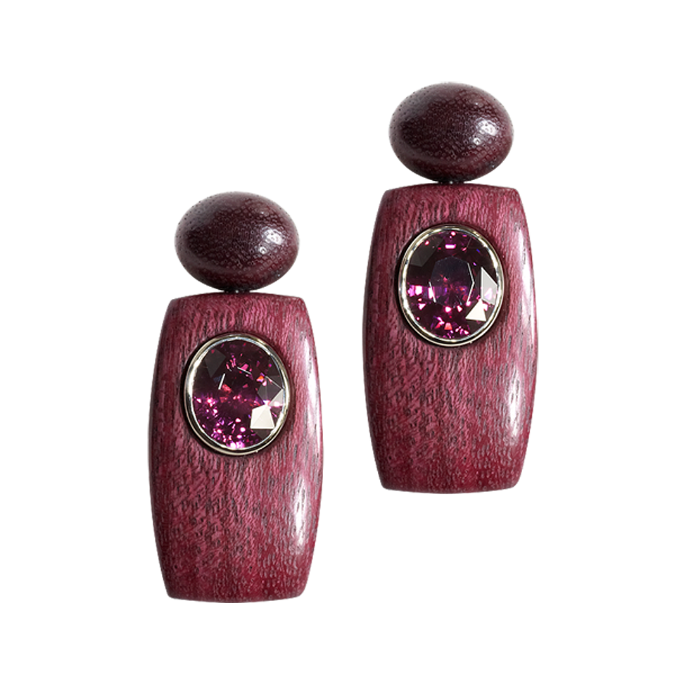 Ohrringe mit himbeerfarbenen Almandin-Granaten und Rahmen sowie Oberteilen aus Amaranth-Holz, in 750/000 Weißgold gefasst. Maßanfertigung, gezeigte Länge 5 cm.