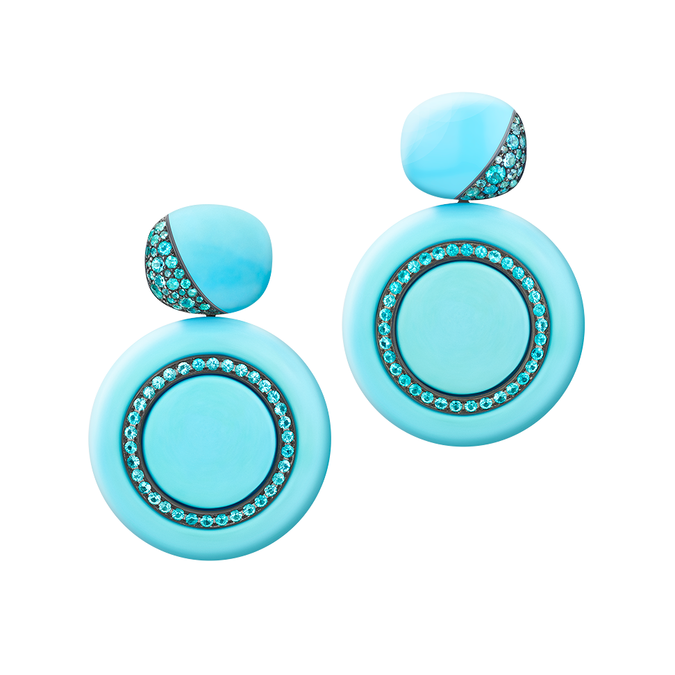 Ohrringe mit diskusförmig und antikoval geschliffenen Türkisen, beide mit Paraiba-Turmalinen intarsiert und in Silberbronze gefasst. Dank unsichtbarer Wechselmechaniken lassen sich die Oberteile einzeln tragen. Maßanfertigung, gezeigte Länge 6 cm.