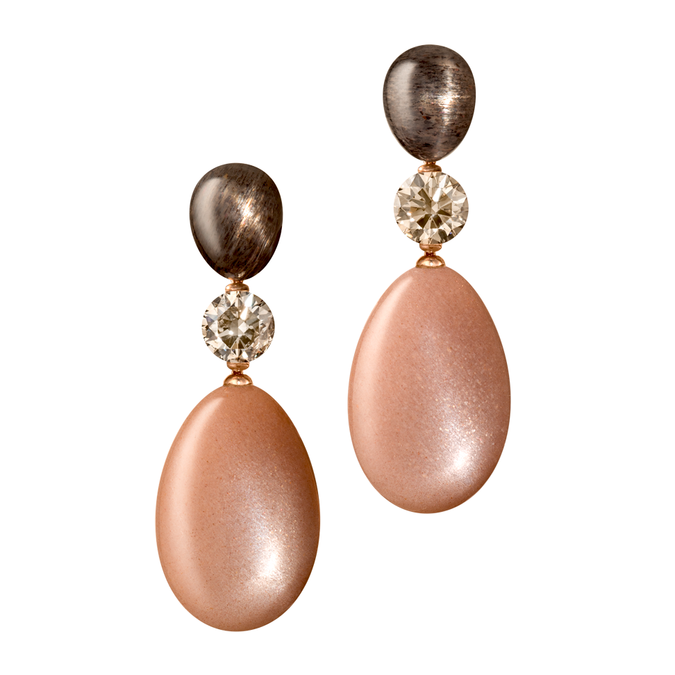 Ohrringe mit apricotfarbenen und dunkelbraunen indischen Mondstein-Cabochons und naturfarbenen Diamanten, in 750/000 Roségold gefasst. Maßanfertigung, gezeigte Länge 5 cm.