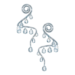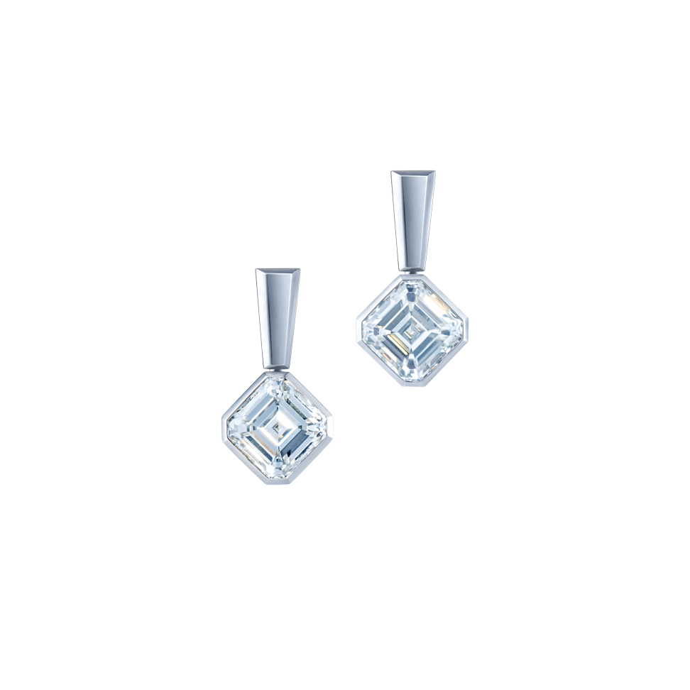 Ohrringe mit Diamanten im historischen Asscher-Schliff und Platin-Oberteilen. Dank unsichtbarer Wechselmechaniken lassen sie sich mit anderen Elemten kombinieren. Maßanfertigung, gezeigte Länge 2 cm.