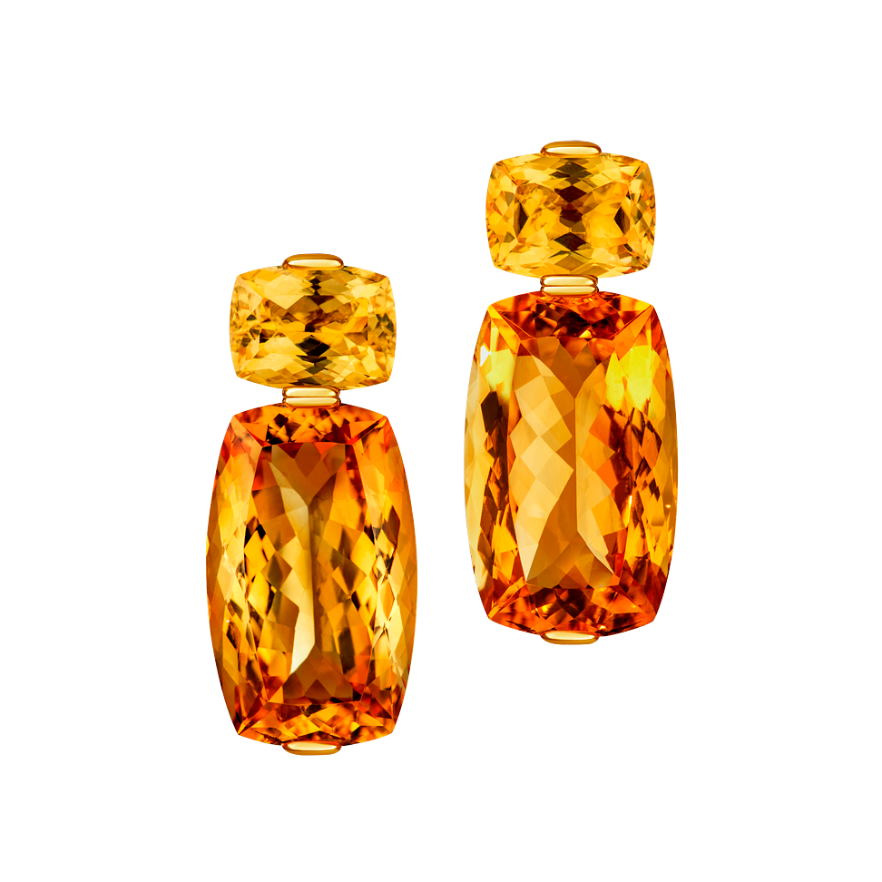Ohrringe mit kissenförmig geschliffenen orangenen und gelben Citrinen, in 750/000 Roségold gefasst. Maßanfertigung, gezeigte Länge 4 cm.