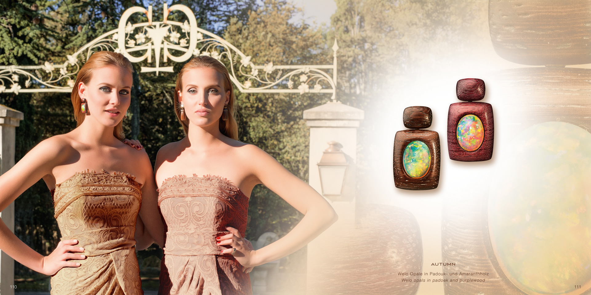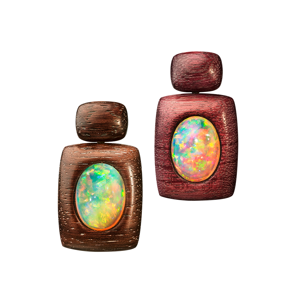 Ohrringe mit Welo-Opal-Cabochons und Rahmen sowie Oberteilen aus Padouk- und Amaranth-Edelholz, unsichtbar in 750/000 Rosé- und Gelbgold gefasst. Maßanfertigung, gezeigte Länge 4,5 cm.