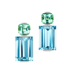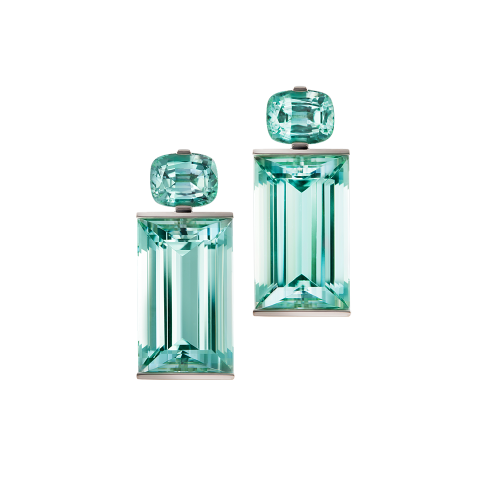 Ohrringe mit baguetteförmigen Aquamarinkristallen und antikovalen Afghanistan-Turmalinen "Clear Crystals", in 750/000 Weißgold gefasst. Maßanfertigung, gezeigte Länge 4 cm.