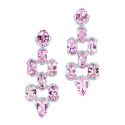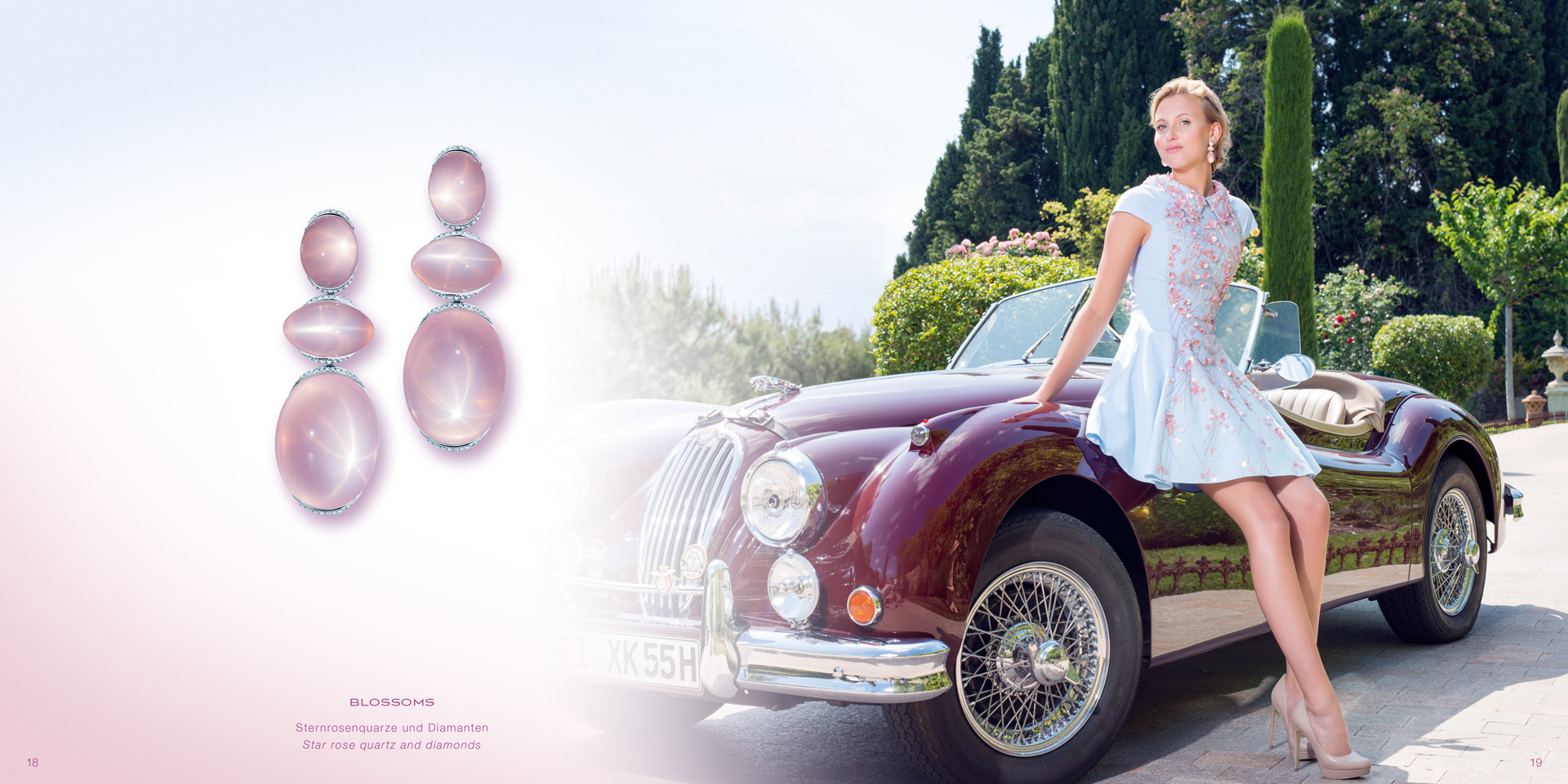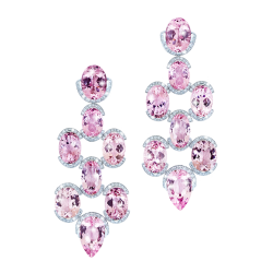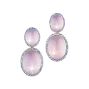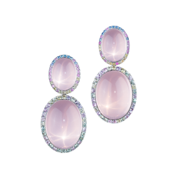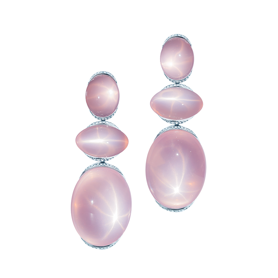 Ohrringe aus Sternrosenquarz-Cabochons, von feinen weißen Diamanten wie ein Blütenkelch punktuell getragen und in 750/000 Weißgold gefasst. Maßanfertigung, gezeigte Länge 6 cm.