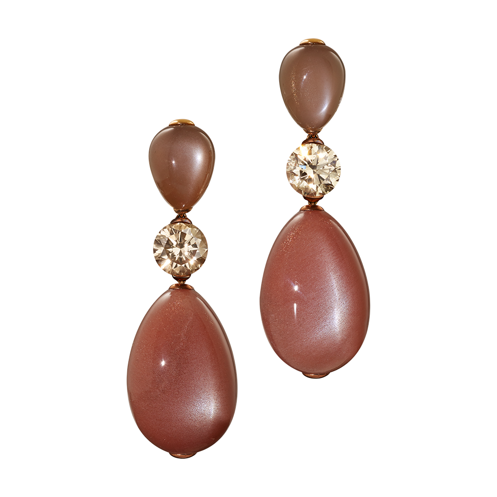 Ohrringe mit erdfarbenen Mondstein-Cabochons und facettierten naturfarbenen Diamanten, in Goldbronze gefasst. Maßanfertigung, gezeigte Länge 6 cm.
