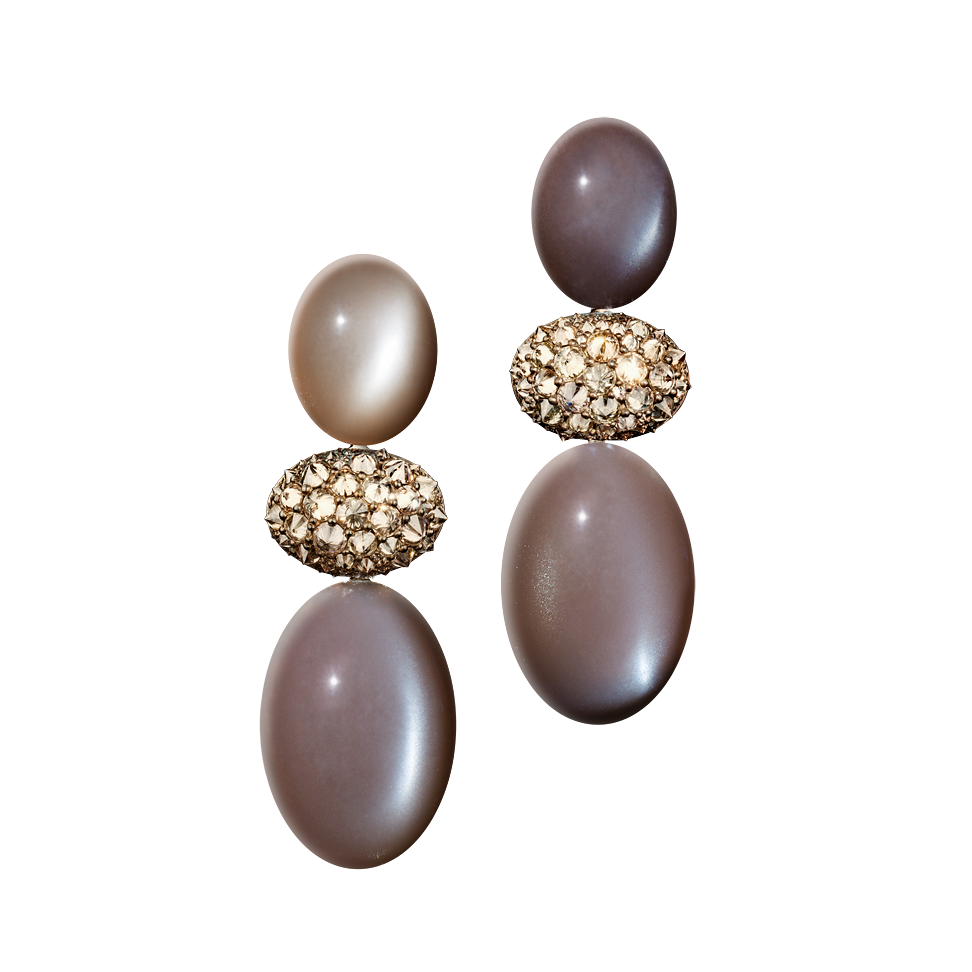 Dreiteilige Ohrringe mit grauen und beigen Mondstein-Cabochons sowie mit naturfarbenen Diamanten bespikten (umgekehrt gefassten) Mittelteilen, in 750/000 Weißgold gefasst. Dank unsichtbarer Wechselmechaniken "Trinity Transformers" lassen sie sich kurz oder lang tragen und mit anderen Elementen kombinieren. Maßanfertigung, gezeigte Länge 5 cm.