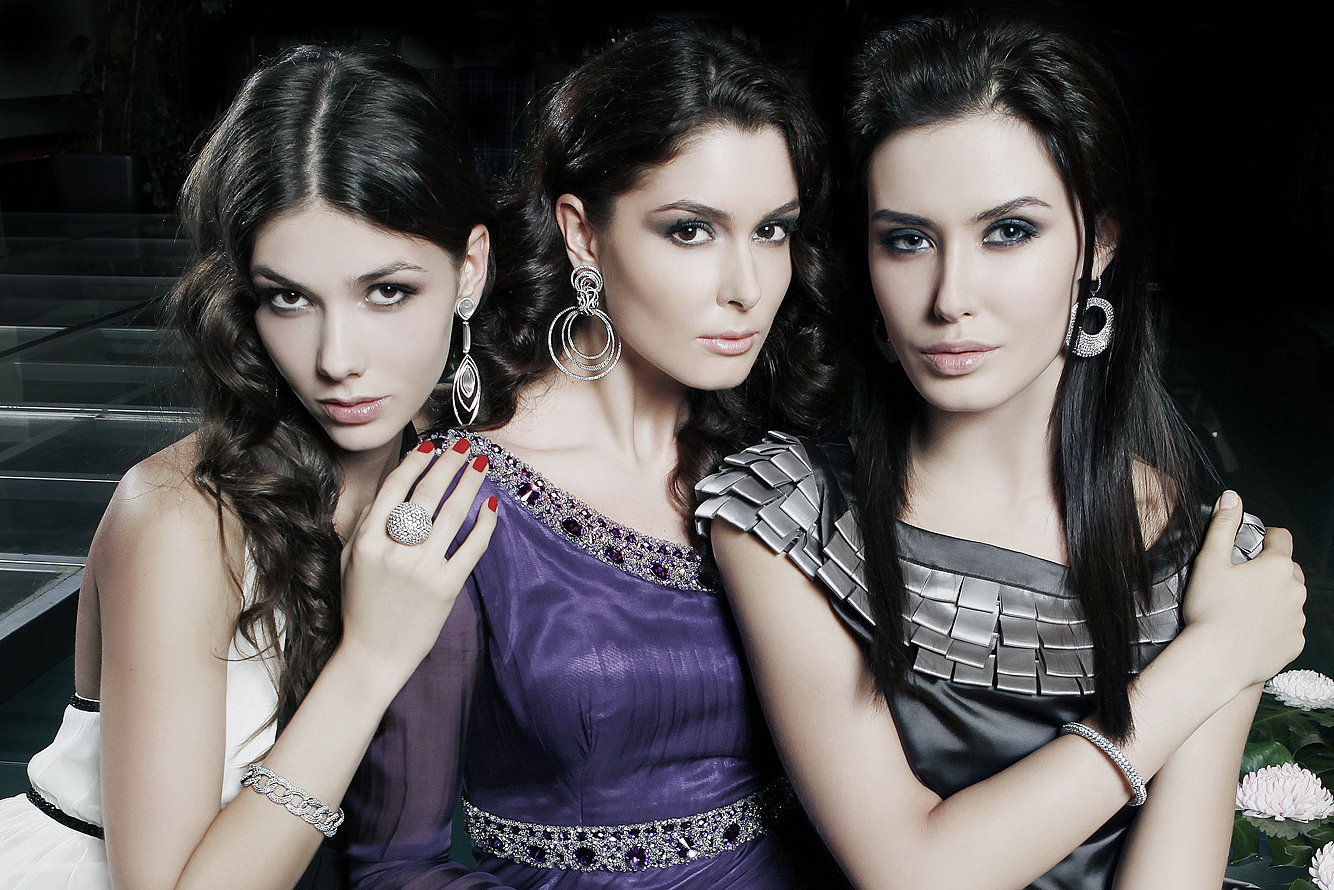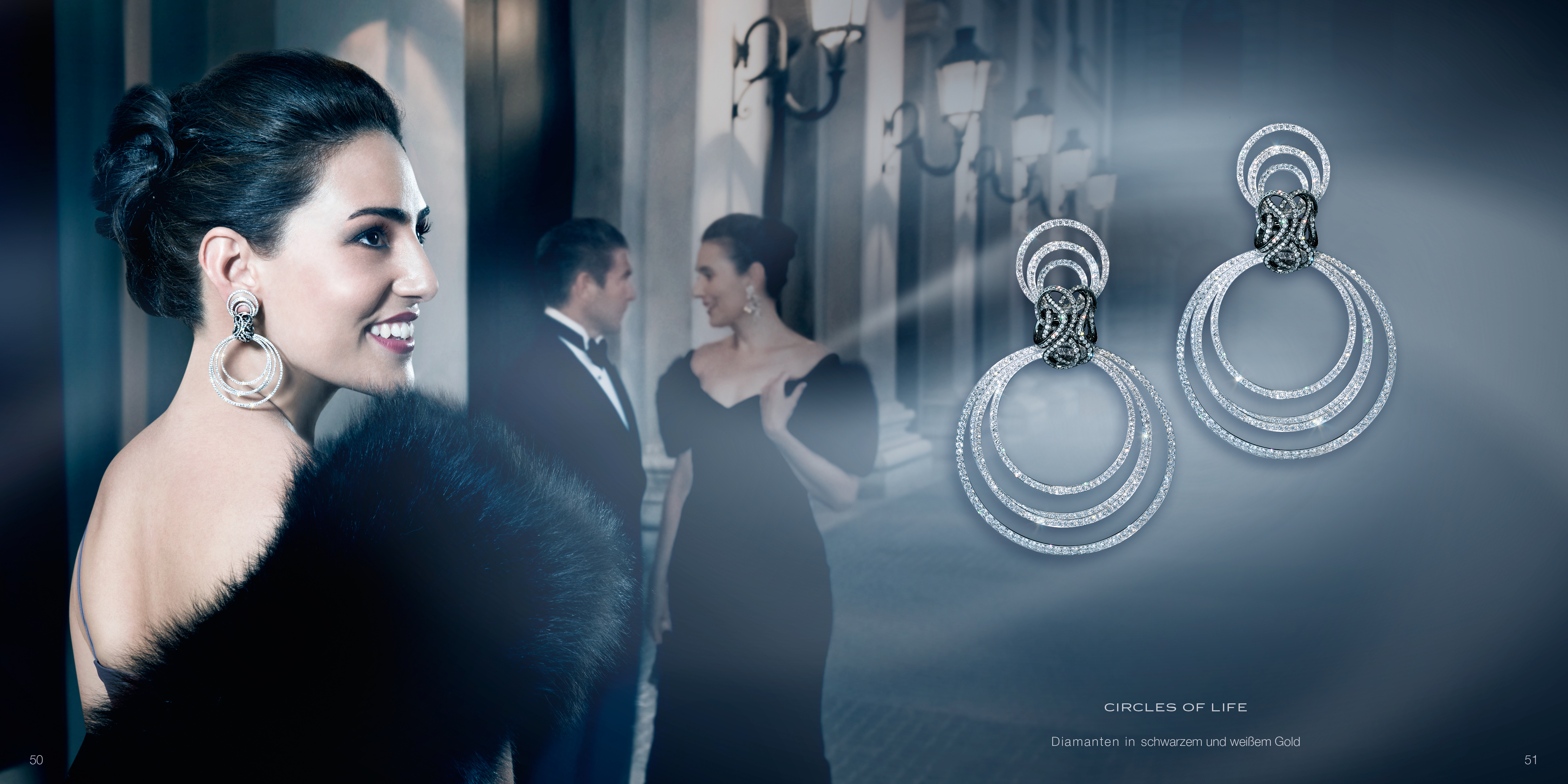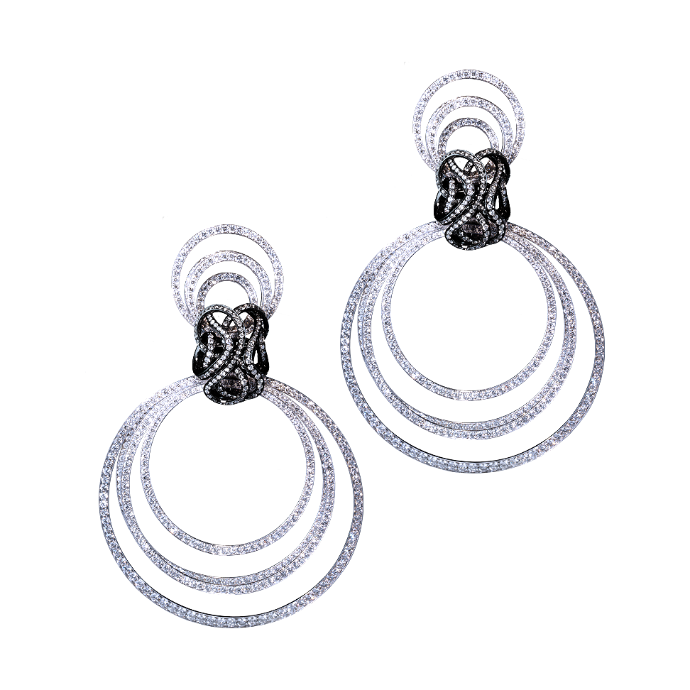 Ohrringe mit frei beweglichen diamantbesetzten Kreisen und gordischen Knoten, in 750/000 Weißgold. Maßanfertigung, gezeigte Länge 7,5 cm.
