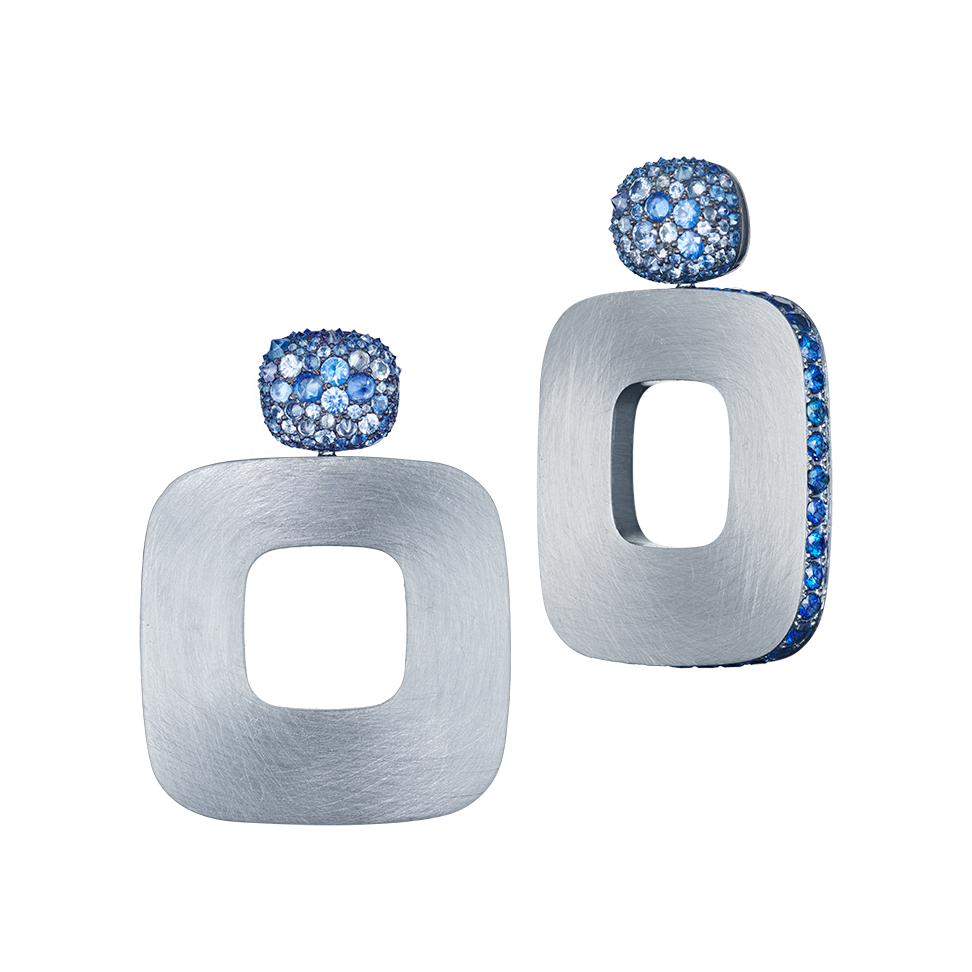 Ohrringe mit Bauhaus-Körpern aus schwarz rhodinierter Silberbronze, seitlich und an den Oberteilen mit blauen Saphiren und grauen Diamanten geziert und in 750/000 Weißgold gefasst. Maßanfertigung, gezeigte Länge 5 cm.