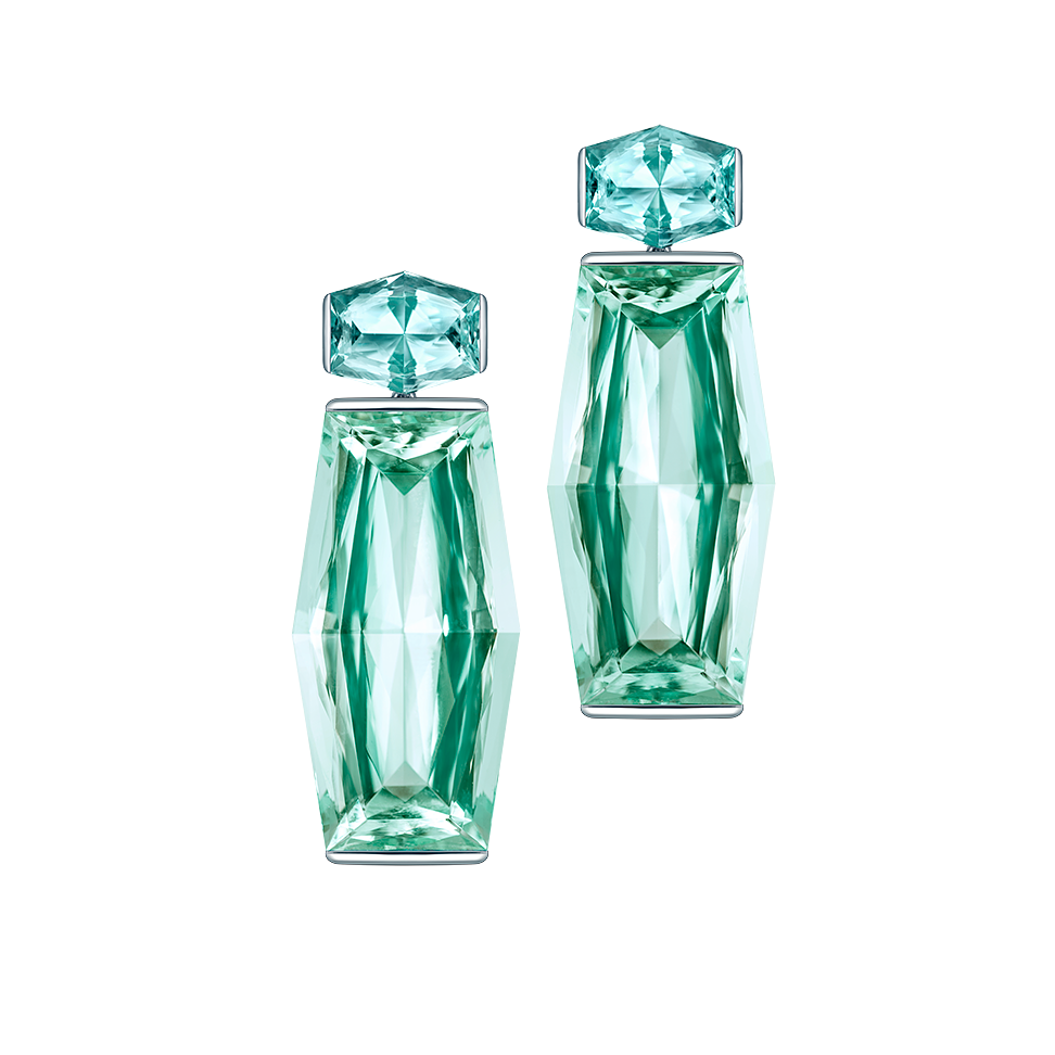 Ohrringe mit fantasiegeschliffenen (Spiegelschliff) zart blauen und grünen Aquamarinen "Clear Crystals", in 750/000 Weißgold gefasst. Maßanfertigung, gezeigte Länge 4,5 cm.