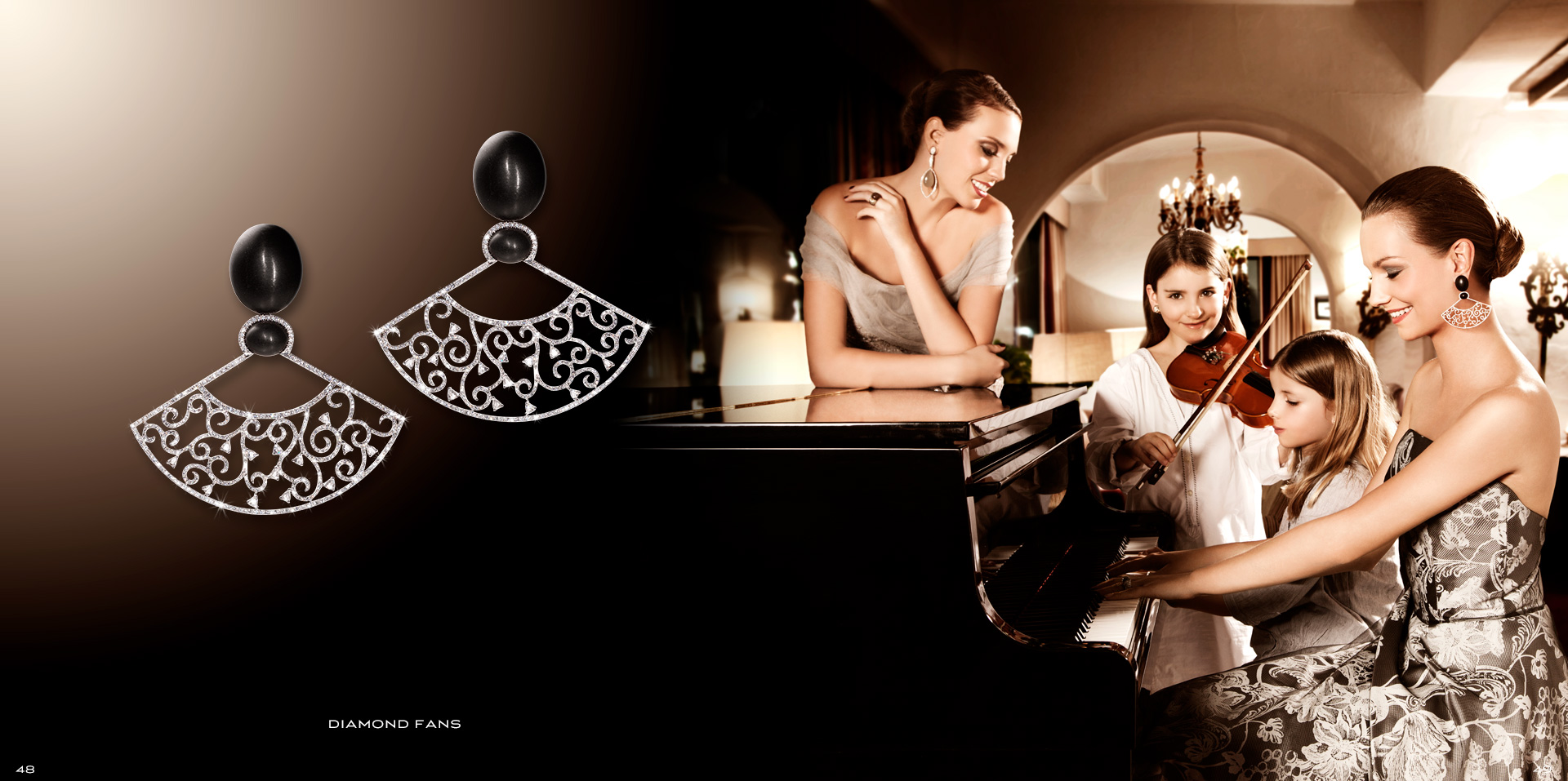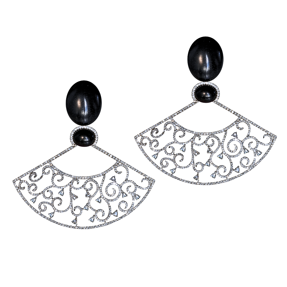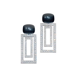 Ohrringe mit Mondstein-Cabochons und filigranen Fächern aus feinen weißen Diamanten, in 750/000 Weißgold gefasst. Dank unsichtbarer Wechselmechniken lassen sich die Oberteile auch einzeln tragen und mit anderen Unterteilen kombinieren. Maßanfertigung, gezeigte Länge 6 cm.