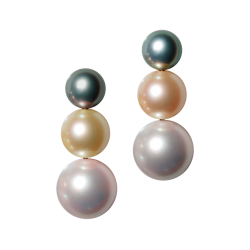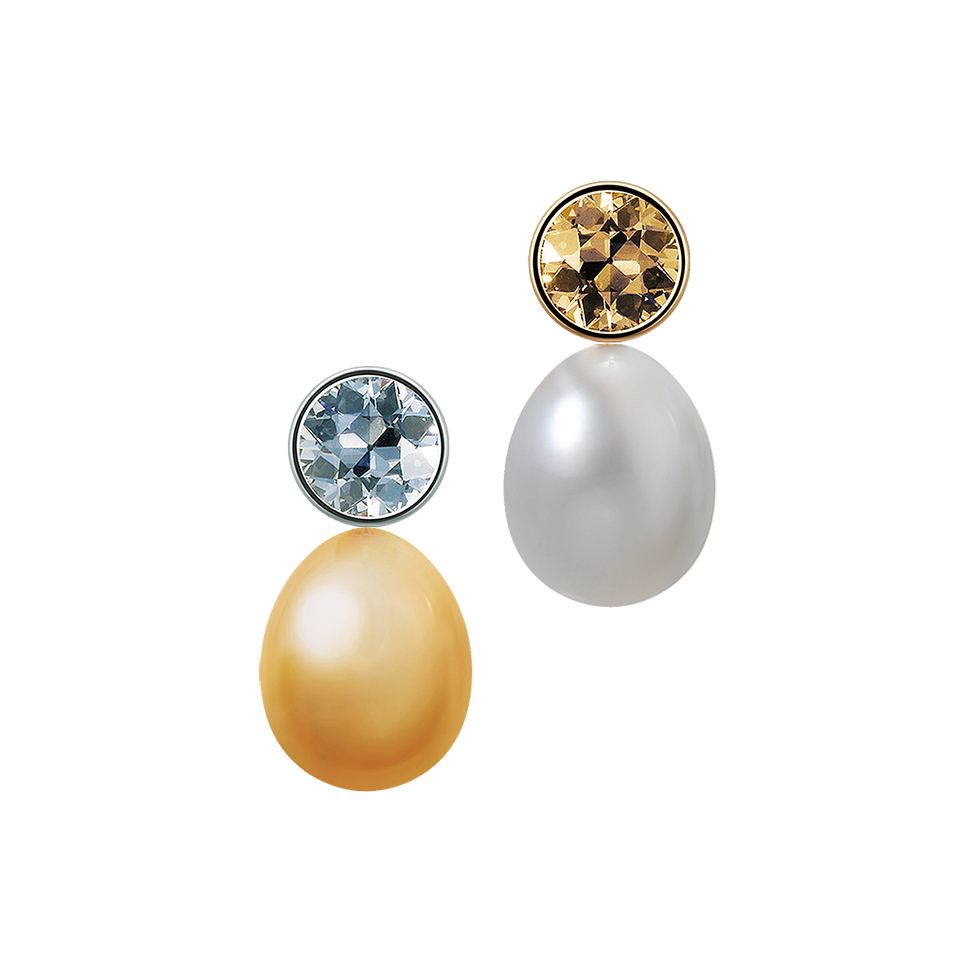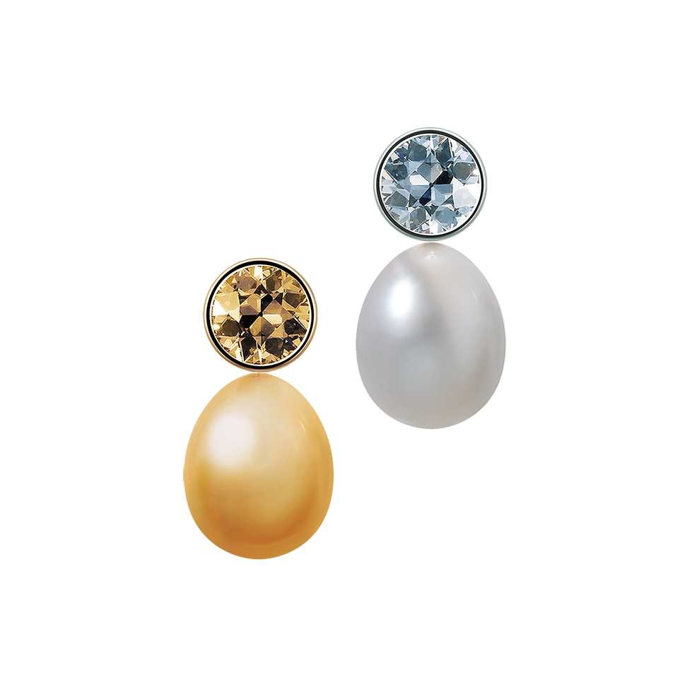 Zweiteilige Ohrringe mit Südseeperltropfen und 4 ct. European-Cut-Diamanten in Gold und Weiß, in 750/000 Gelbgold bzw. Platin gefasst und durch eine unsichtbare Wechselmechanik verbunden. Dadurch lassen sich die Diamanten alleine als Stecker oder auch mit den Perlen farblich gegengleich tragen. Maßanfertigung, gezeigte Länge 3 cm.