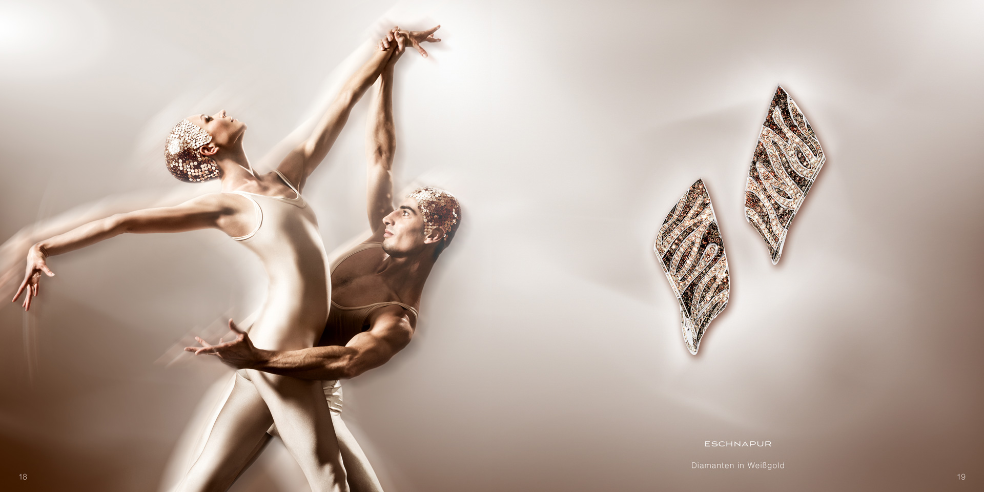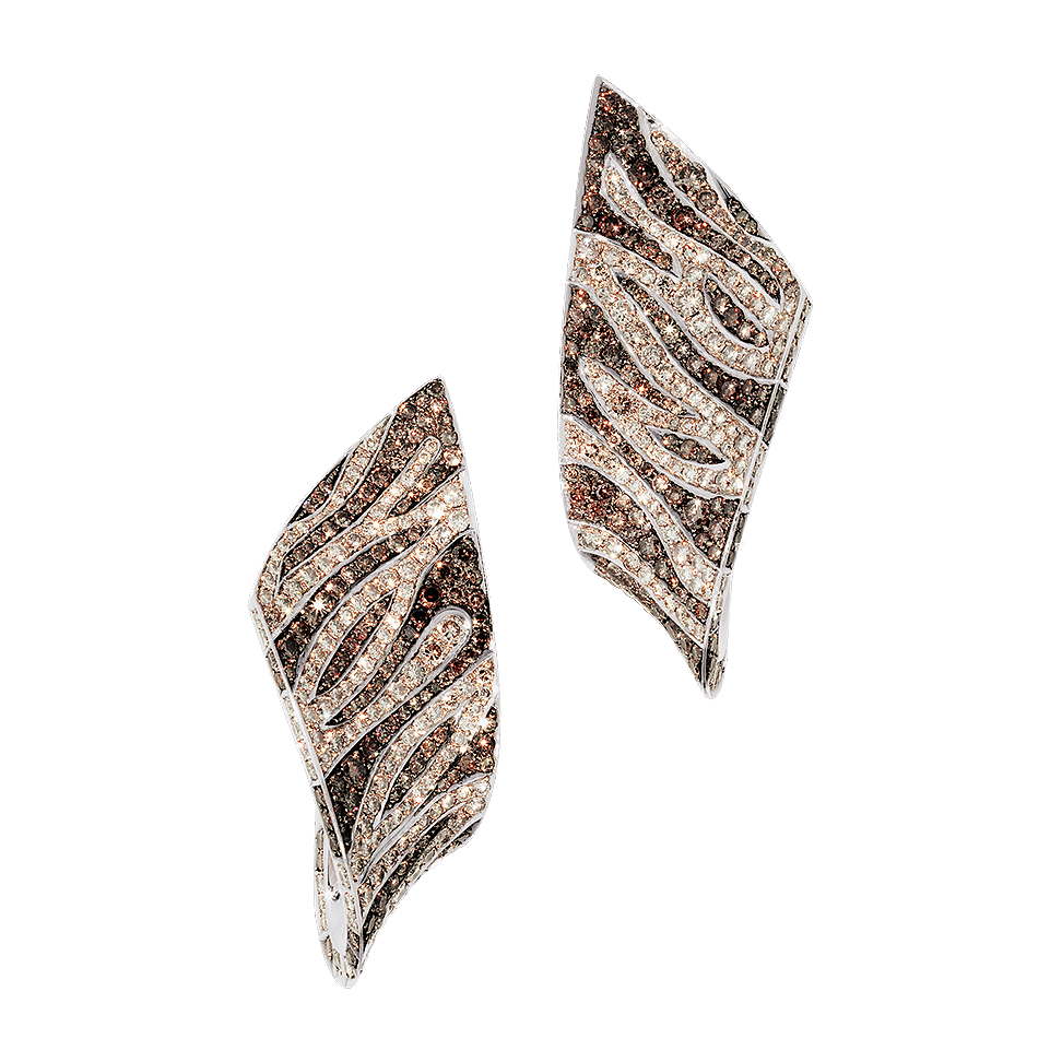 Ohrring-Clips in Anmutung einer Welle mit weißen und naturfarbenen Diamanten im Zebra-Muster, in 750/000 Weißgold und geschwärztes Weißgold gefasst. Maßanfertigung, gezeigte Länge 4,5 cm.