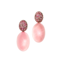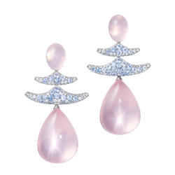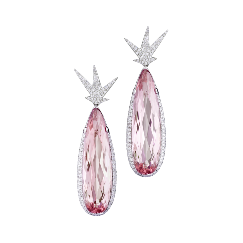 Ohrringe mit rosafarbenen, tropfenförmigen Kunziten, umrahmt von weißen Diamanten und einem sternförmigen, diamantbesetzten Oberteil, gefasst in 750/000 Weißgold. Maßanfertigung, gezeigte Länge 4 cm.