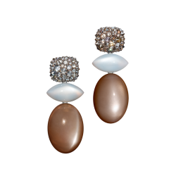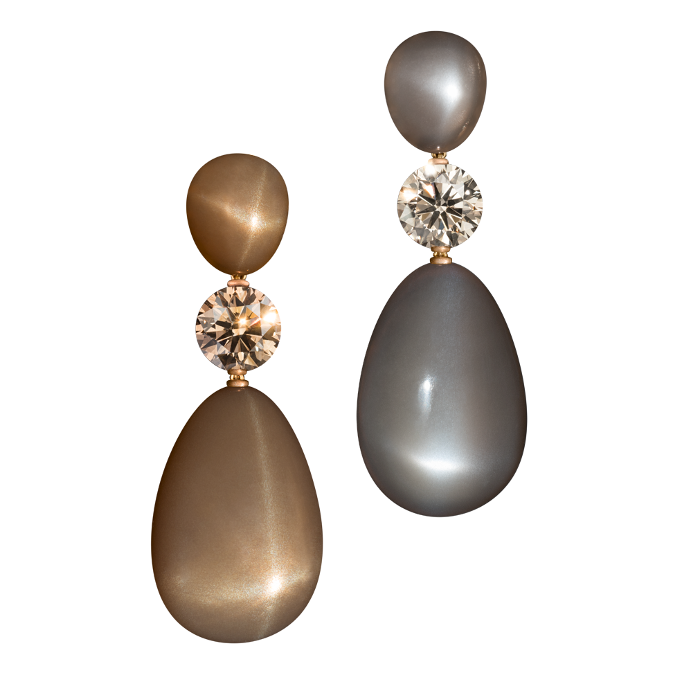Ohrringe mit braunen und grauen indischen Mondstein-Cabochons sowie farblich harmonischen Diamanten, in 750/000 Roségold gefasst. Maßanfertigung, gezeigte Länge 5 cm.