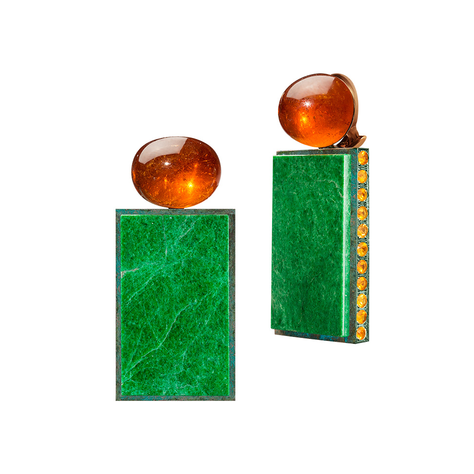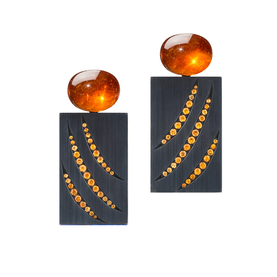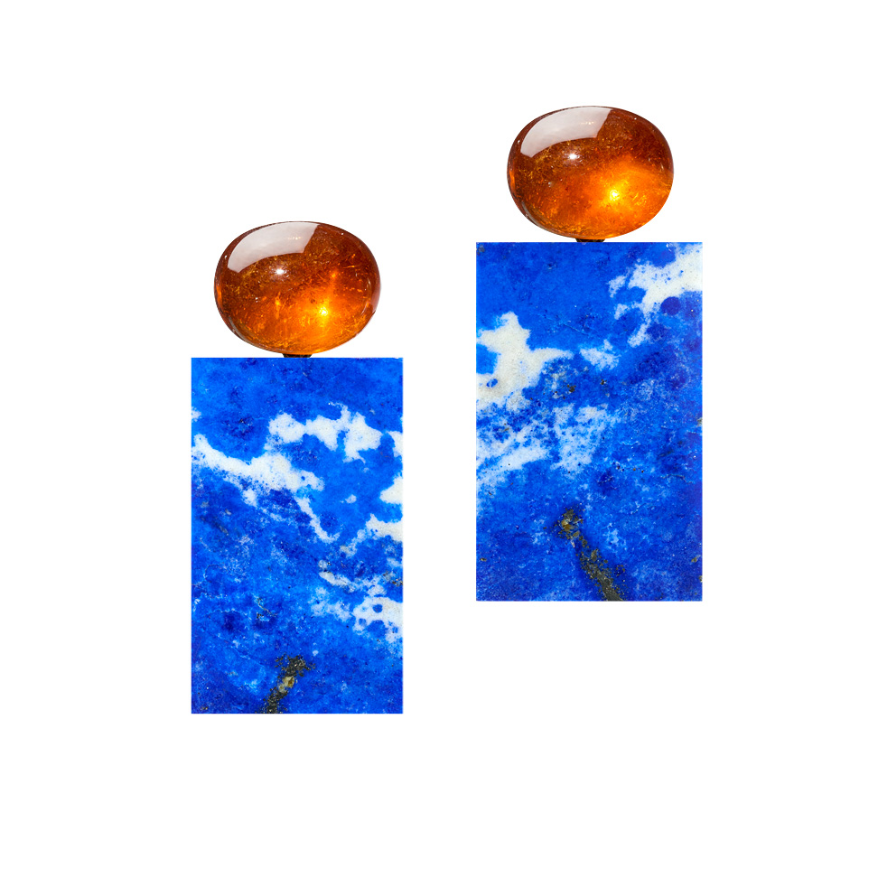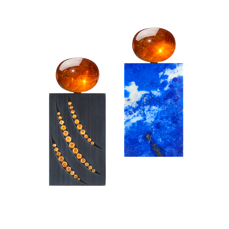 Ohrringe mit Lapislazuli-Platten, rückseitig mit Mandarin-Granaten in Silberbronze geziert, sowie Mandarin-Granat-Cabochons, in Goldbronze gefasst. Dank unsichtbarer Wechselmechaniken lassen sie sich beidseitig oder mit den Unterteilen "Indian Summer" tragen. Maßanfertigung, gezeigte Länge 4,5 cm.