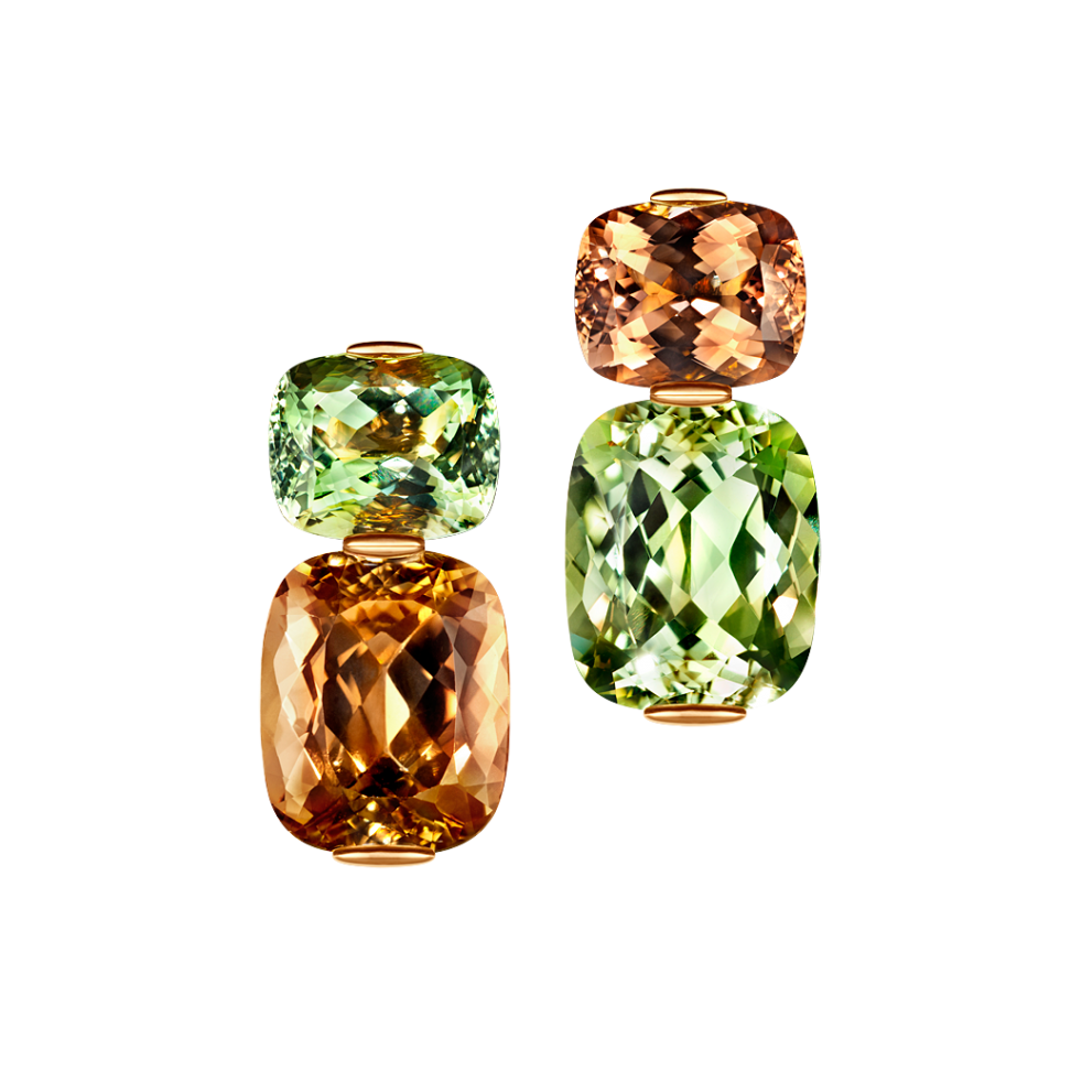 Ohrringe mit antikoval geschliffenen, gegengleich gesetzten Goldberyllen und grünen Turmalinen, in 750/000 Roségold gefasst. Maßanfertigung, gezeigte Länge 3,5 cm.