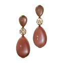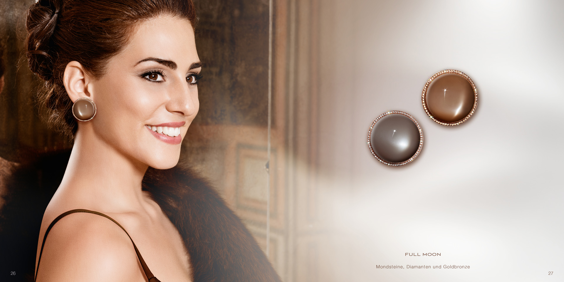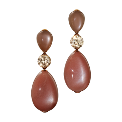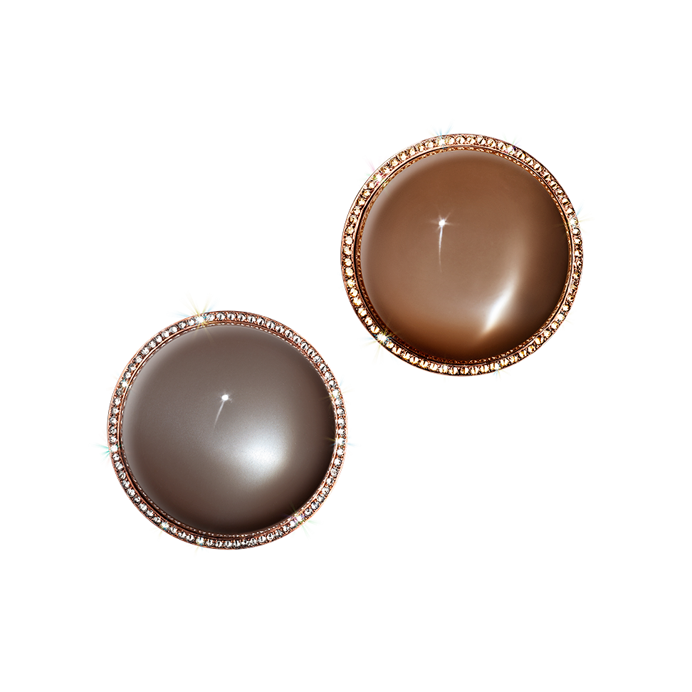 Ohrring-Clipse mit einem grauen und einem braunen Mondstein-Cabochon, von feinen grauen und Diamanten gerahmt und in Silber- bzw. Goldbronze gefasst. Maßanfertigung, gezeigter Durchmesser 3,5 cm.