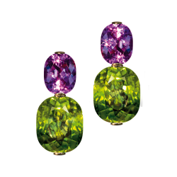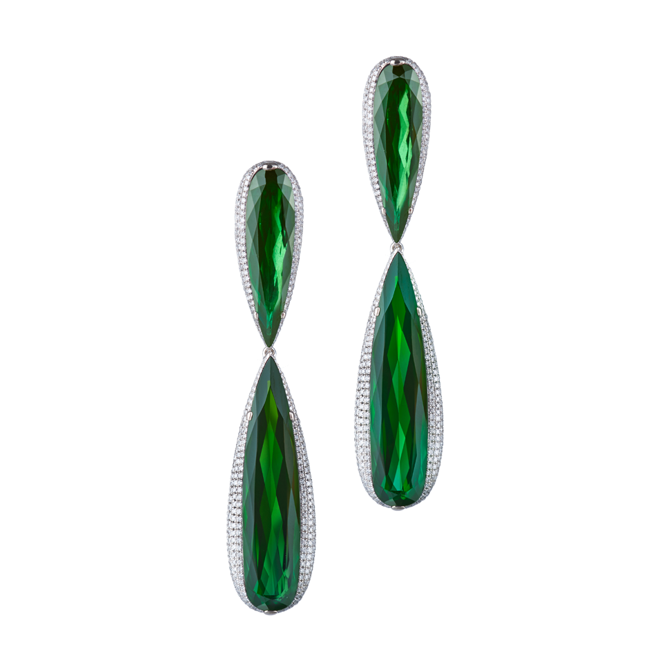 Ohrringe mit grünen afrikanischen Turmalinen, zu schlanken Tropfen geschliffen, von weißen Diamanten gerahmt und in 750/000 Weißgold gefasst. Maßanfertigung, gezeigte Länge 5,5 cm.