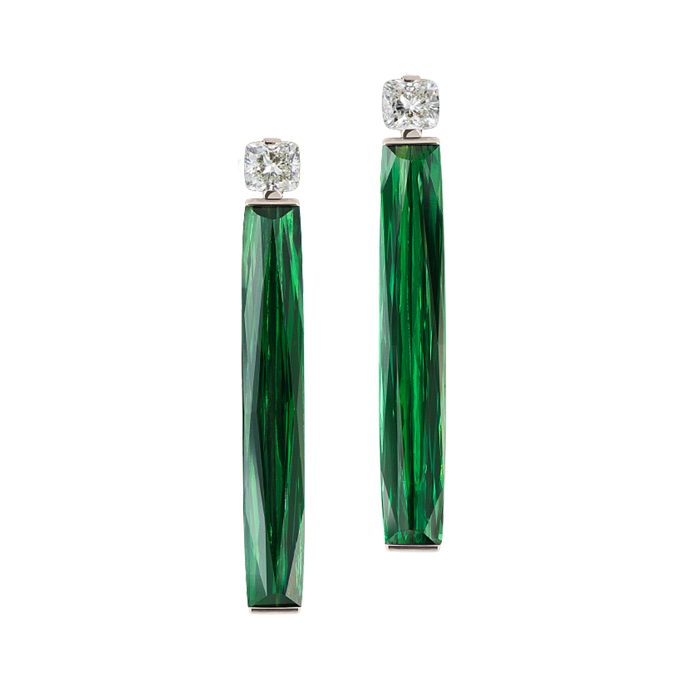 Ohrringe mit Turmalinen aus Namibia, zu schlanken, gespannten Baguettes geschliffen, und warmweißen Diamanten im Kissenschliff, in 750/000 Weißgold gefasst. Maßanfertigung, gezeigte Länge 4,5 cm.