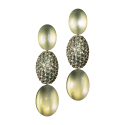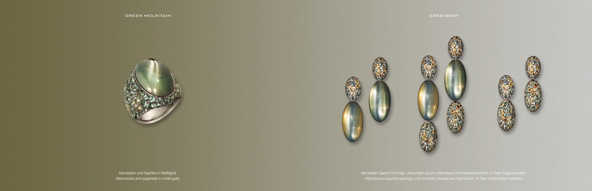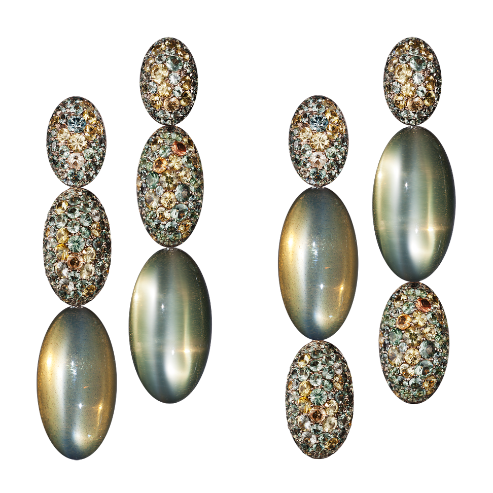 Dreiteilige Ohrringe mit grünen Mondstein-Cabochons und mit gelbgrünen Sri Lanka-Saphiren besetzten Ovalen, in 750/000 Weißgold gefasst und mit unsichtbaren Wechselmechaniken "Trinity Transformers" verbunden. Dadurch lassen sie sich in verschiedenen Längen tragen. Maßanfertigung, gezeigte Länge 9 cm.
