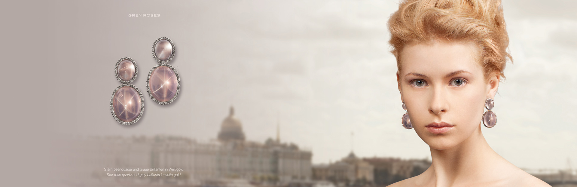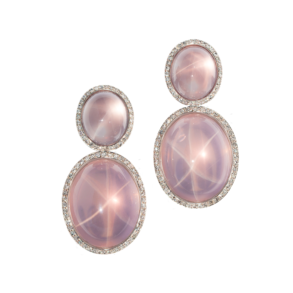 Ohrringe aus Sternrosenquarz-Cabochons, von grauen Diamanten gerahmt und in 750/000 Weißgold gefasst. Maßanfertigung, gezeigte Länge 4,5 cm.