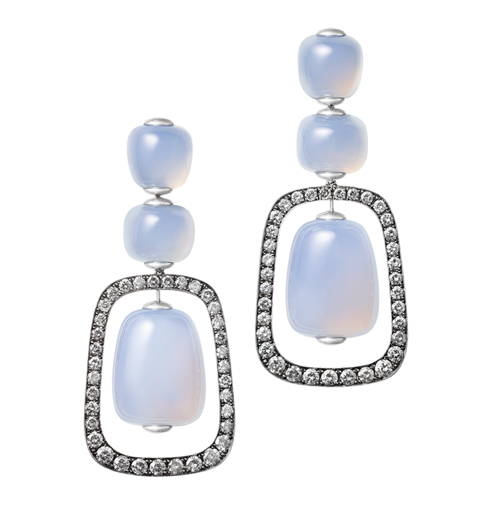 Ohrringe aus Chalzedon-Cabochons mit Ösenverbindungen und in 750/000 Weißgold gefasst. Die unteren Hänger sind frei schwebend von grauen Diamanten gerahmt. Maßanfertigung, gezeigte Länge 6,5 cm.