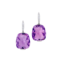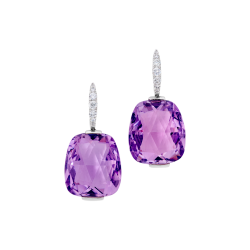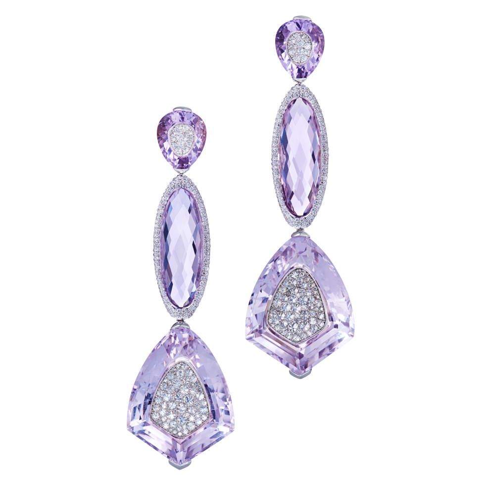 Ohrringe mit fantasiegeschliffenen indischen Amethysten und weißen Diamanten, in 750/000 Weißgold gefasst. Maßanfertigung, gezeigte Länge 7 cm.