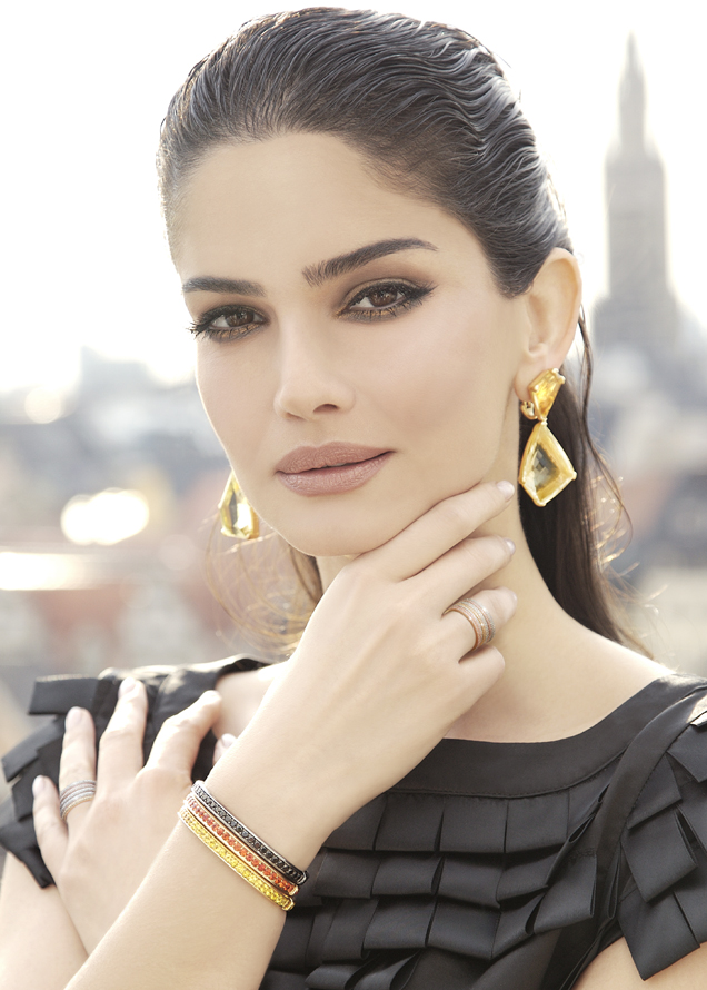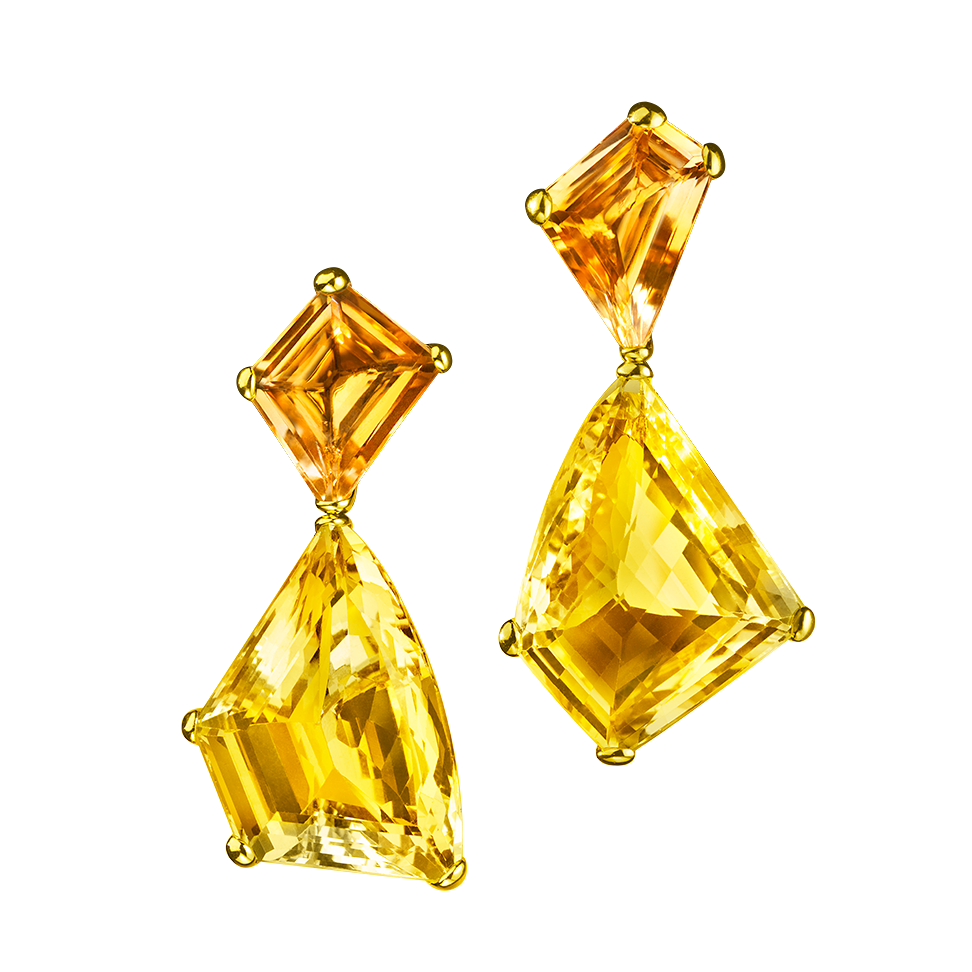 Ohrringe mit fantasiegeschliffenen gelben und orangenen Citrinen, in 750/000 Gelbgold gefasst. Maßanfertigung, gezeigte Länge 4,5 cm.