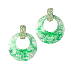 Ohrringe aus gravierter, chinesischer Jade, verbunden durch Glieder, die mit grünen Granaten besetzt, in 750/000 Gelbgold gefasst und zum Öffnen konzipiert sind. Dadurch lassen sie sich in verschiedenen Längen tragen. Maßanfertigung, gezeigte Länge 6,5 cm.