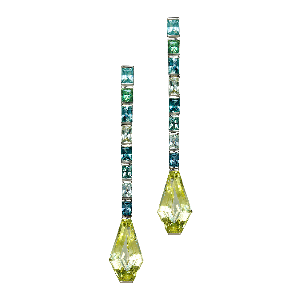 Ohrringe mit facettierten gelbgrünen Goldberyllen und baguetteförmig geschliffenen Montana-Saphiren, in 750/000 Weißgold gefasst. Maßanfertigung, gezeigte Länge 8 cm.