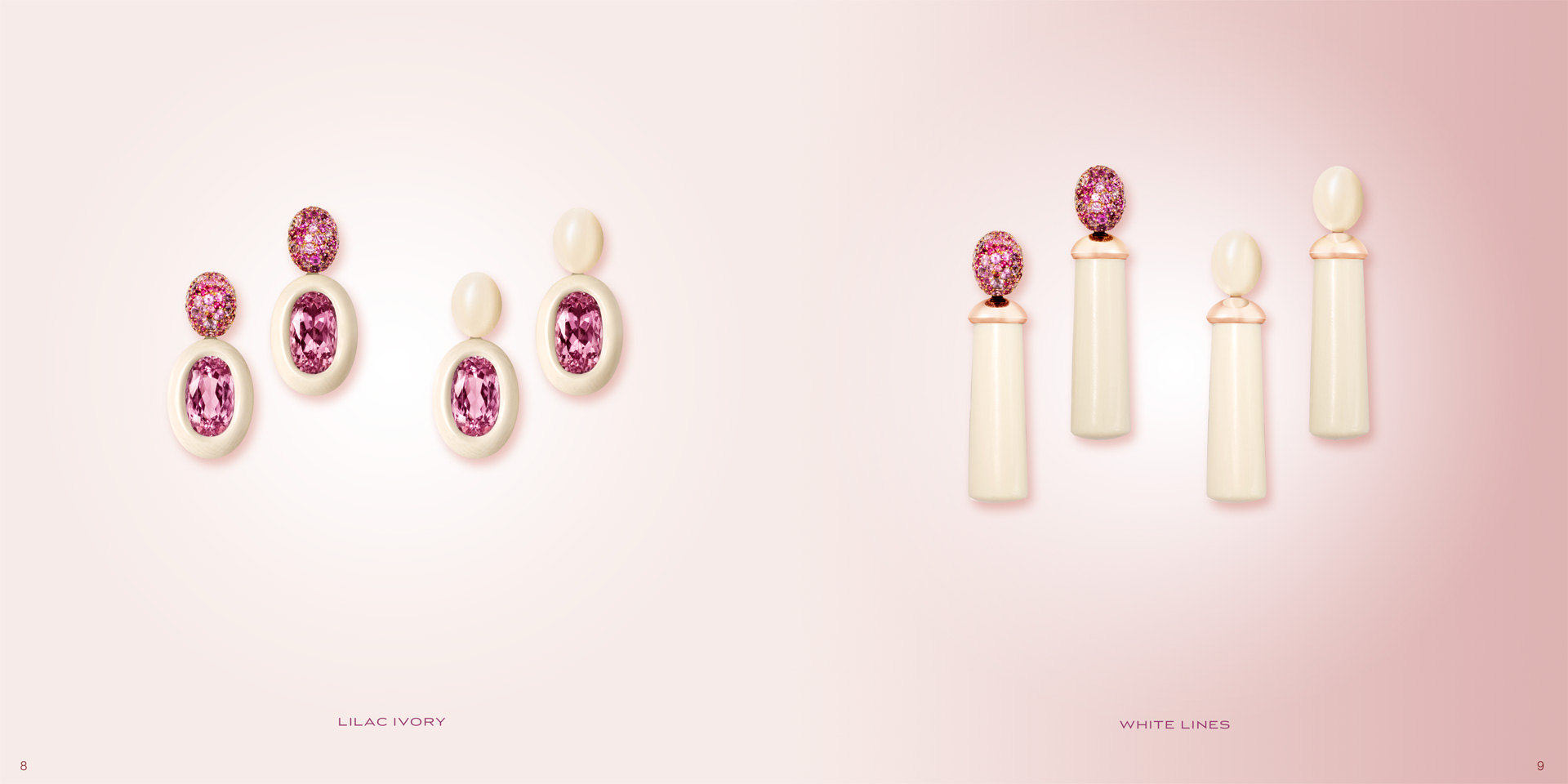 Zweiteilige Ohrringe mit oval geschliffenen brasilianischen Kunziten, von Mammutzahn umrahmt und von 750/000 Gelbgold rückseitig getragen. Durch eine unsichtbare Wechselmechanik lassen sie sich wahlweise mit Oberteilen aus pinken Saphiren oder purem Mammutzahn tragen. Maßanfertigung, gezeigte Länge 4 cm.