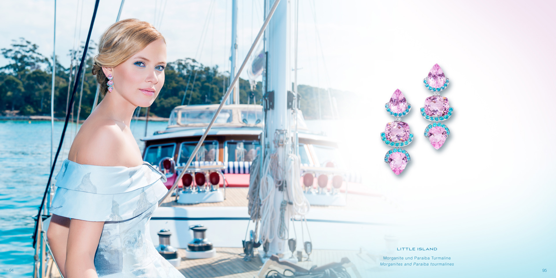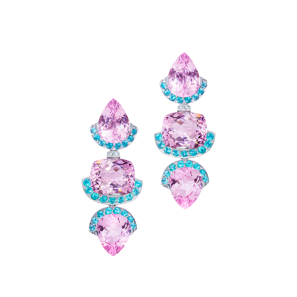 Chandelier-Ohrringe mit tropfen- und kissenförmigen Madagaskar-Morganiten, von brasilianischen Paraiba-Turmalinen gerahmt und in 750/000 Weißgold gefasst. Maßanfertigung, gezeigte Länge 4 cm.
