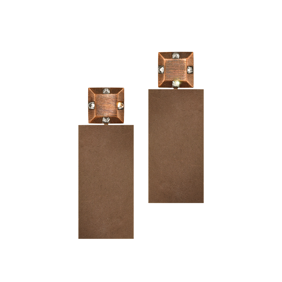 Ohrringe aus deutschem Schiefer, zu puristischen Rechtecken geschliffen, und mit Diamanten besetzter Goldbronze. Maßanfertigung, gezeigte Länge 4,5 cm.