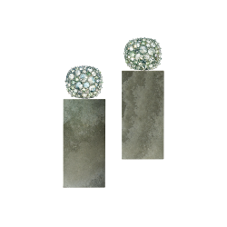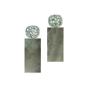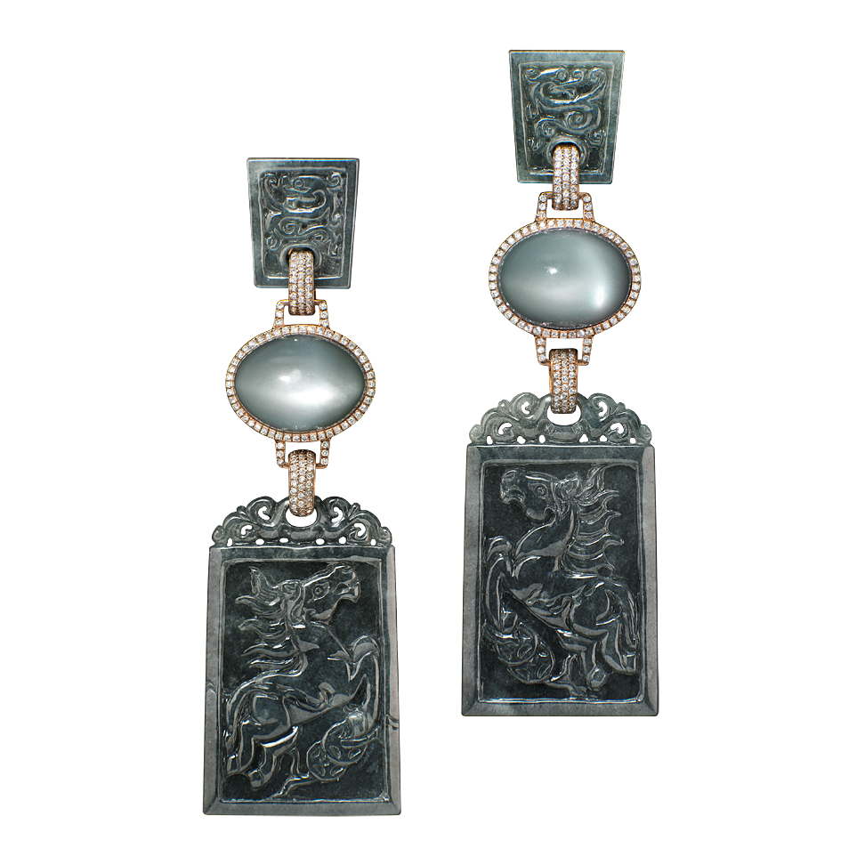 Ohrringe mit gravierten Elementen aus grauer chinesischer Jade, grauen indischen Mondstein-Cabochons und feinen grauen Diamanten, in Silberbronze gefasst. Maßanfertigung, gezeigte Länge 5 cm.
