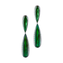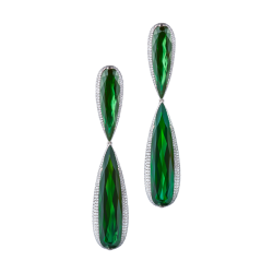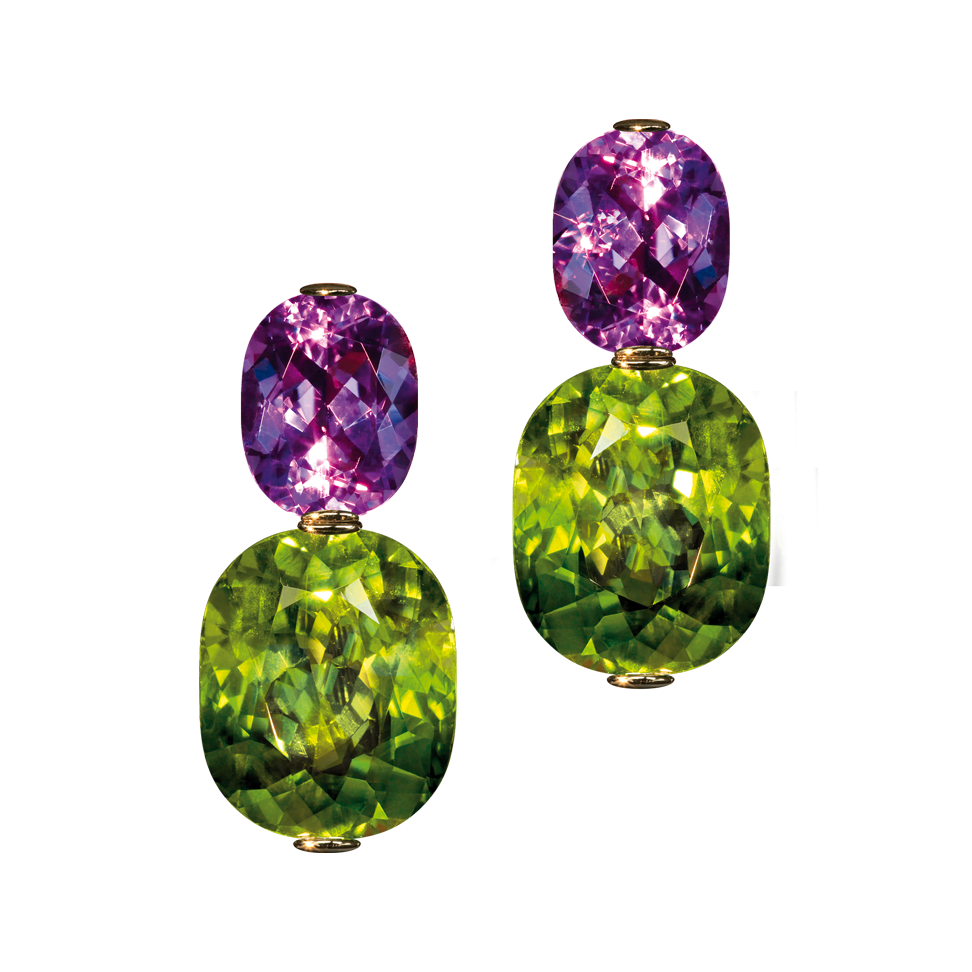 Ohrringe mit antikoval geschliffenen grünen Peridots und lilafarbenen Amethysten, in 750/000 Weißgold gefasst. Maßanfertigung, gezeigte Länge 4,5 cm. Dank unsichtbarer Wechselmechaniken lassen sich die Oberteile variieren.
