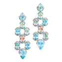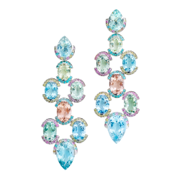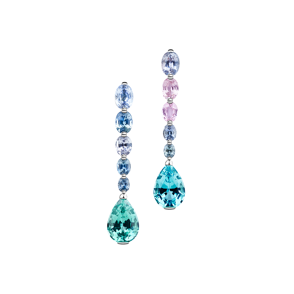 Ohrringe mit meerblauen facettierten Turmalin-Tropfen und Montana-Saphiren in Pastellfarben, in 750/000 Weißgold gefasst. Maßanfertigung, gezeigte Länge 4 cm.