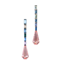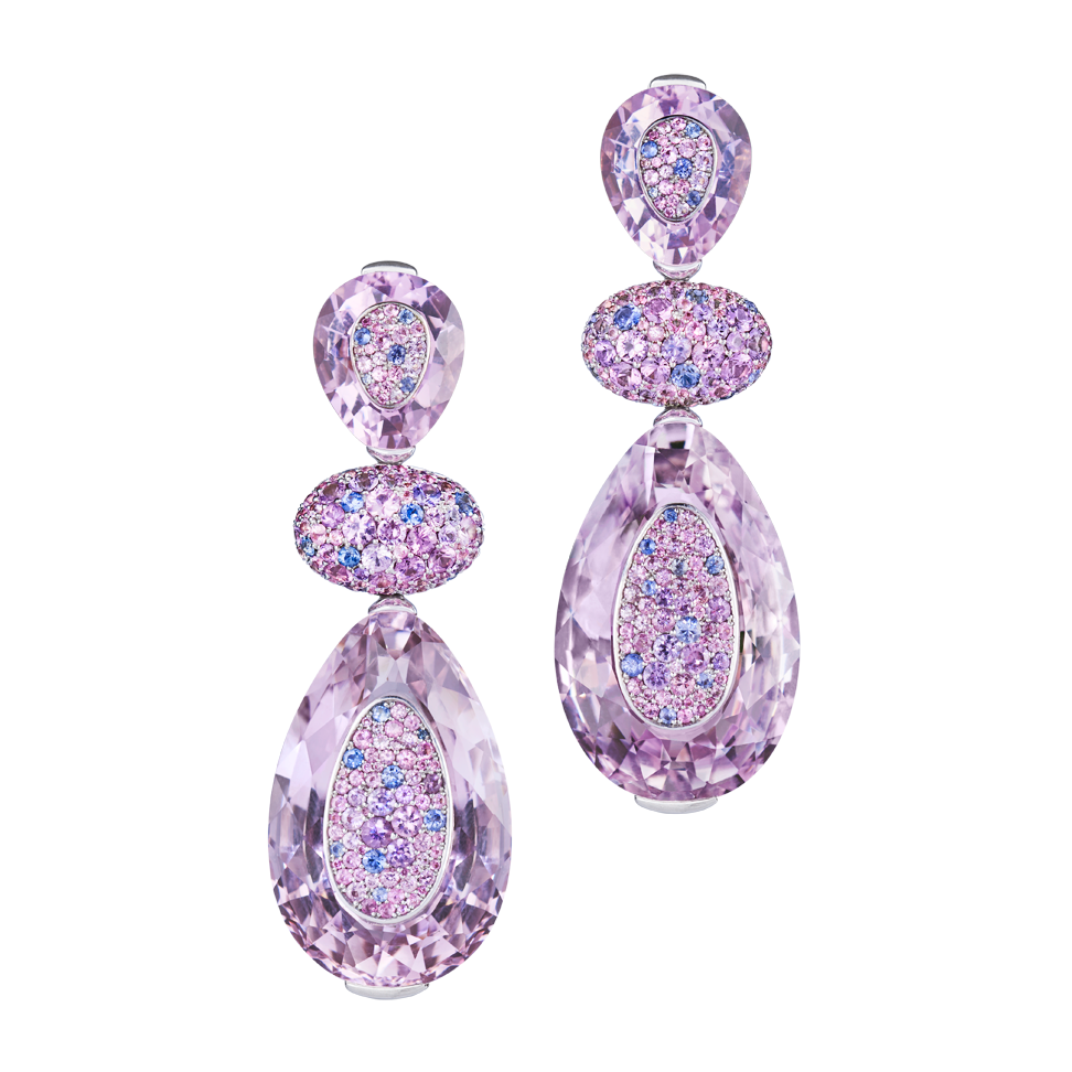 Dreiteilige Ohrringe mit tropfenförmigen, facettiert geschliffenen Amethysten, in die pastellfarbene Saphire in 750/000 Weißgold eingefasst sind. Durch die unsichtbare Wechselmechanik "Trinity Transformers" lassen sie sich kurz oder lang tragen und mit anderen Elementen kombinieren. Maßanfertigung, gezeigte Länge 5,5 cm.