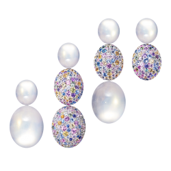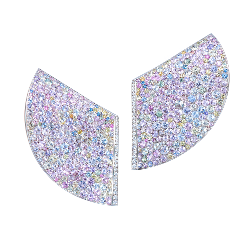 Ohrringe in Wellenform mit pastellfarbenen Saphiren und konisch verlaufenden, weißen Diamanten an den Innenseiten, gefasst in 750/000 Weißgold. Maßanfertigung, gezeigtes Diagonalmaß 6 cm.